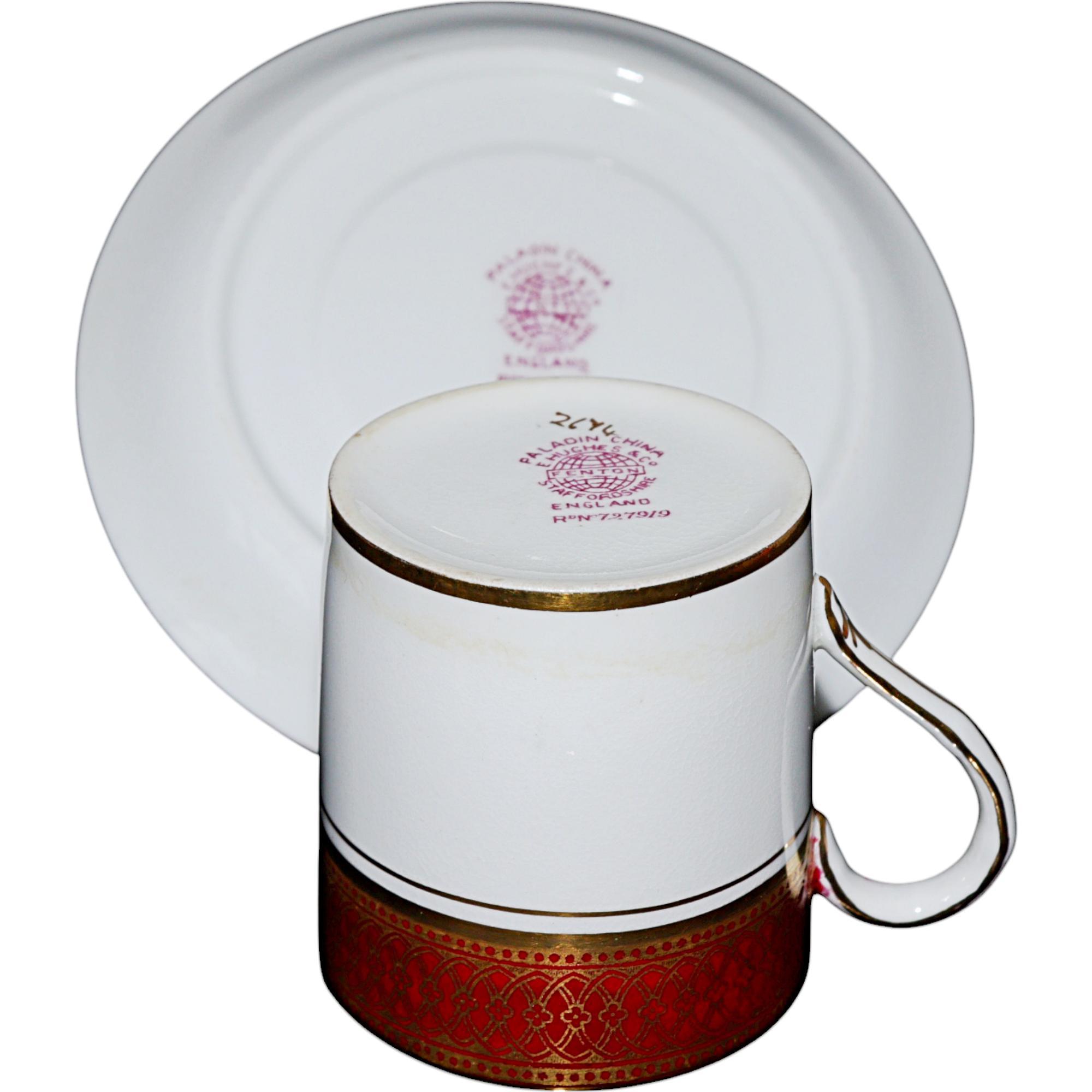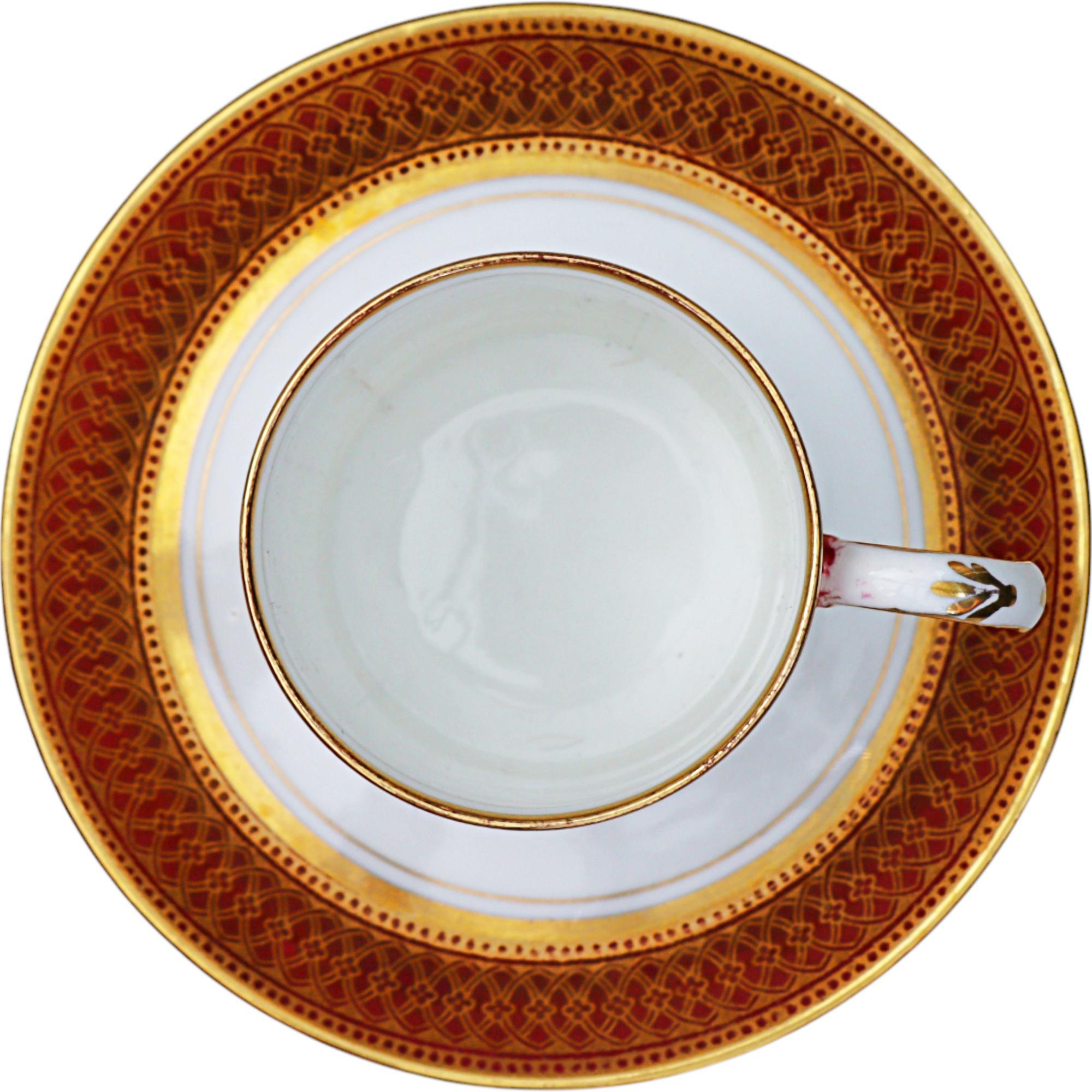E Hughes and Co, Paladin China, elegant stylish bone china china coffee espresso can and saucer, claret bands with gilt gothic trellis decoration, Fenton Staffordshire, printed marks and registration number 727919 for 1926
