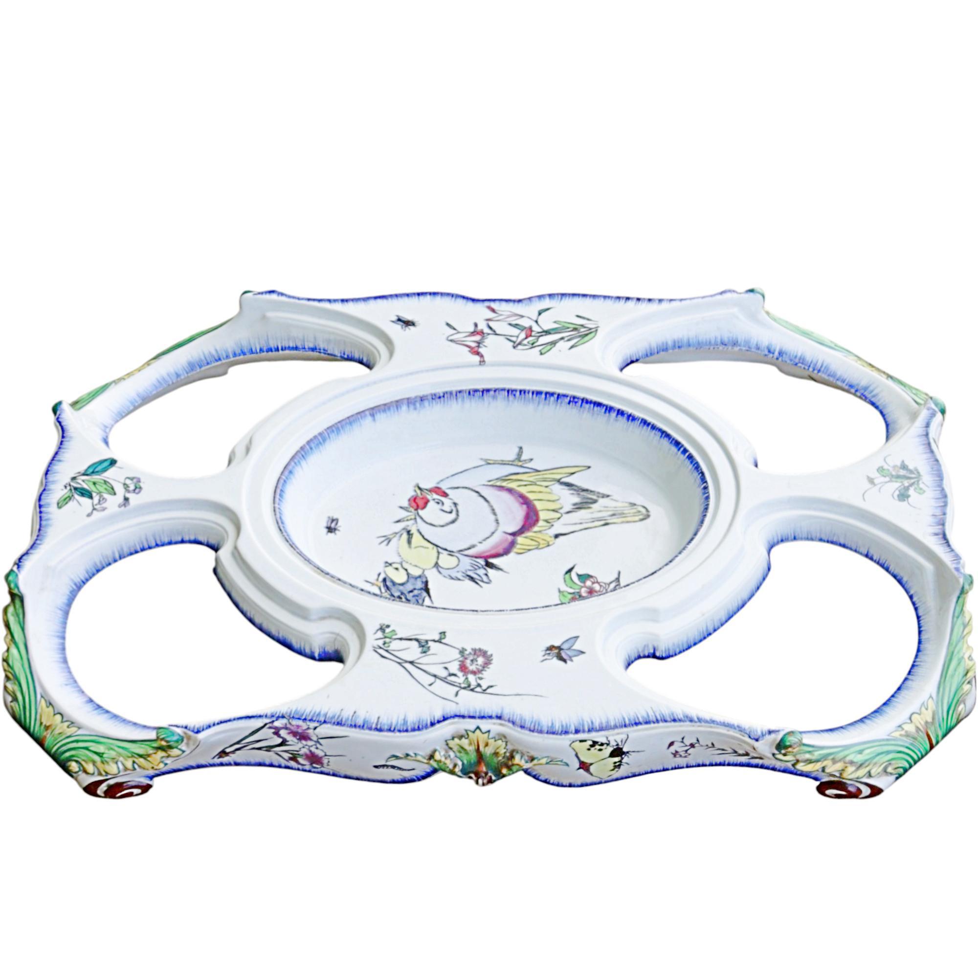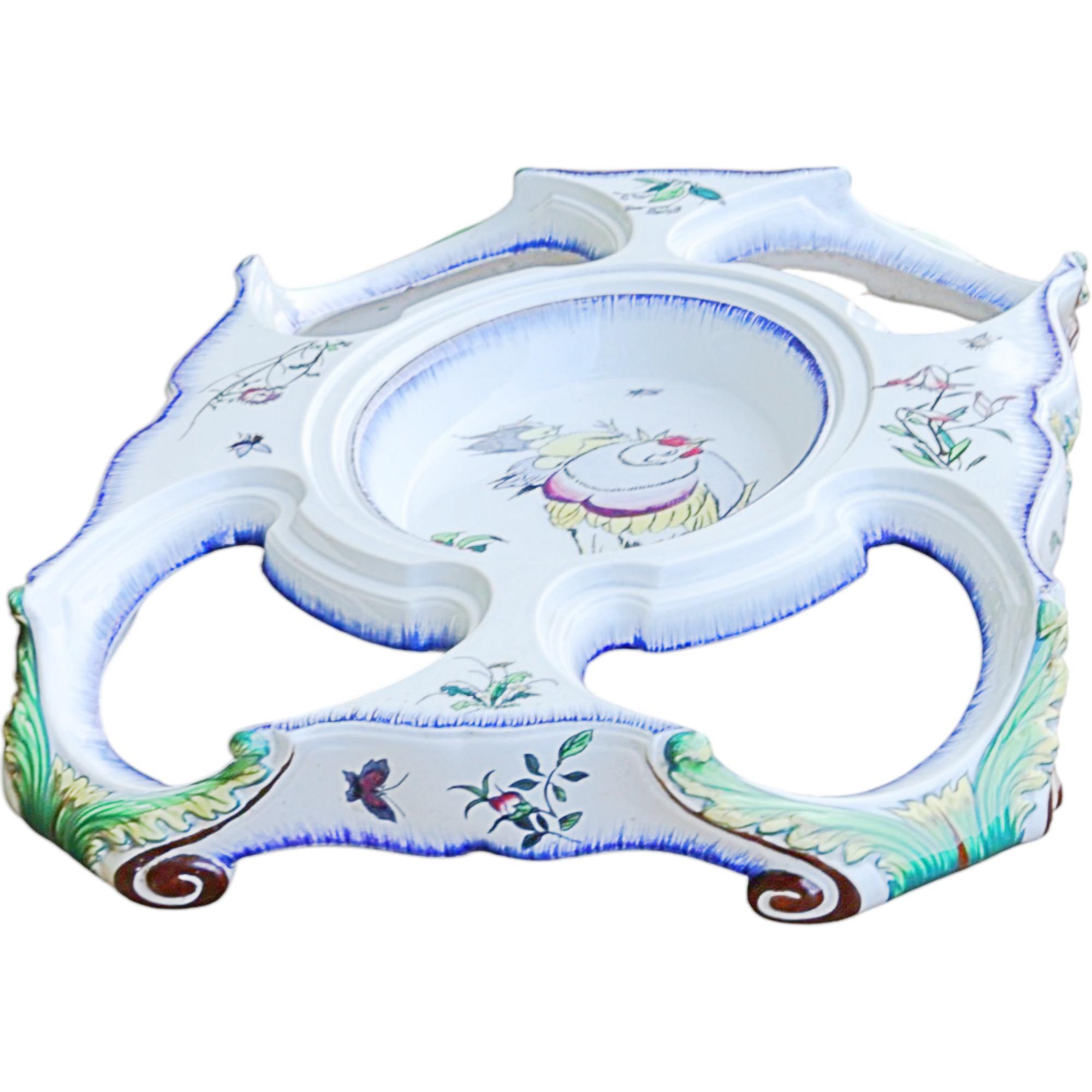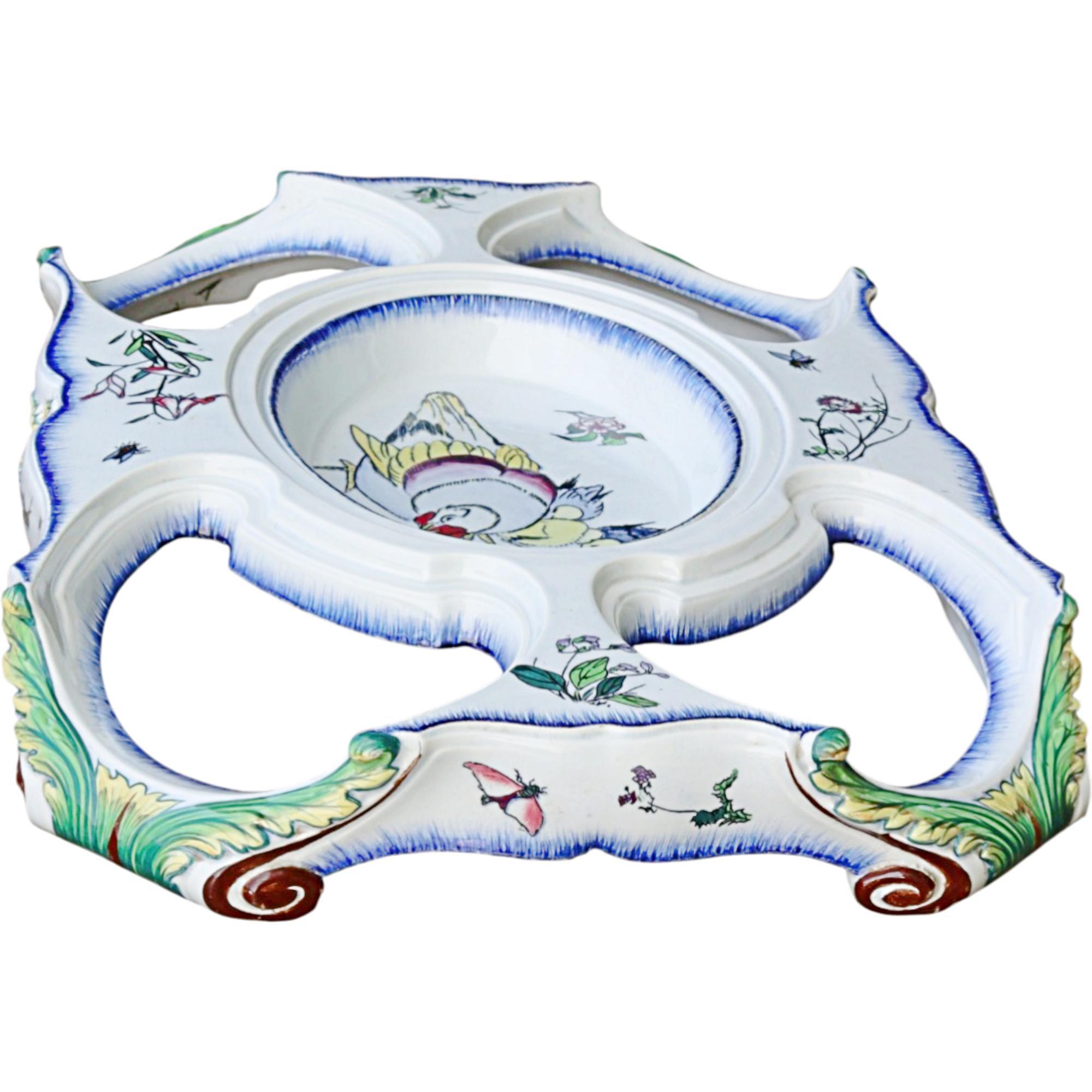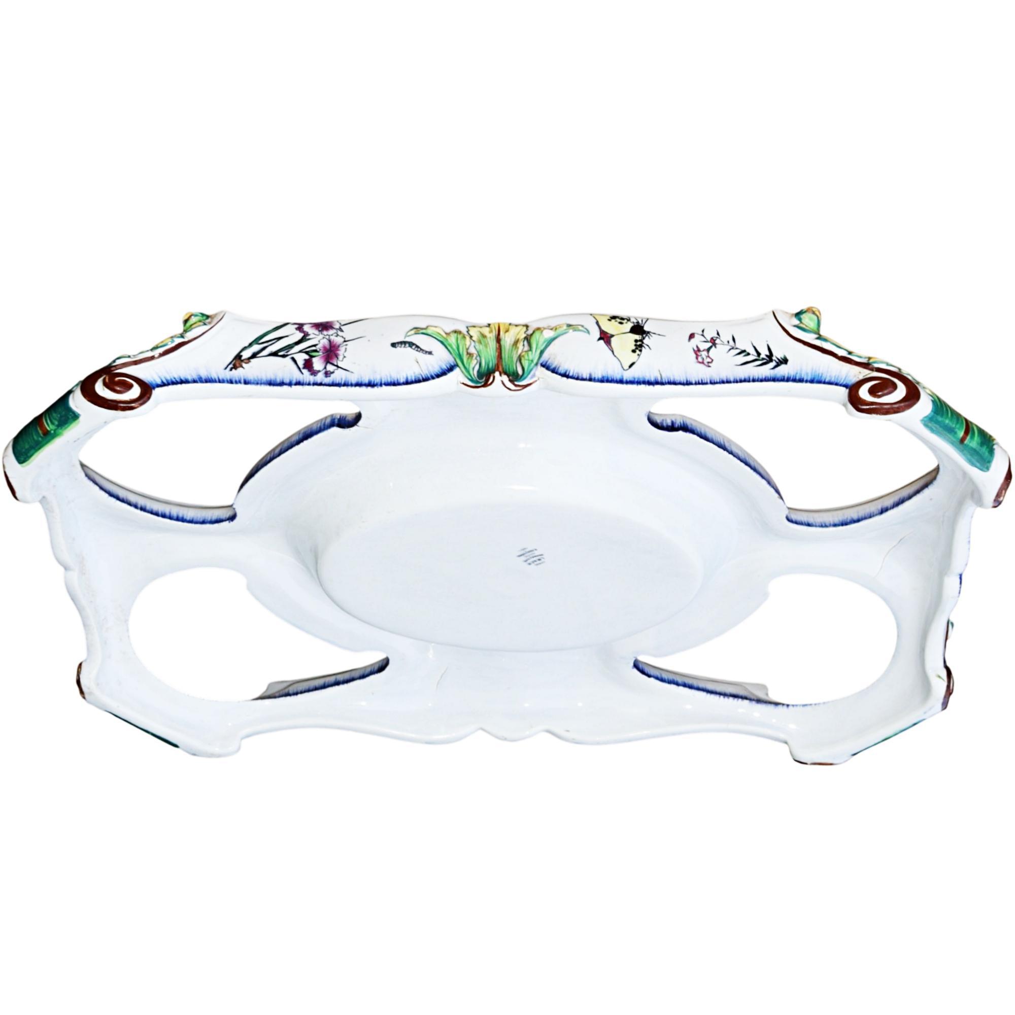 Large pedestal for a centerpiece, Faïencerie creil et montereau, 1840 - 1884, France, faience, black printing stamp underglaze 'Creil B&Cie Montereau Modele E. Rousseau Paris'; pierced, polychrome painted with scenes insects, birds, flowers, heavily damaged and repaired, 9 x 62 x 42 cm