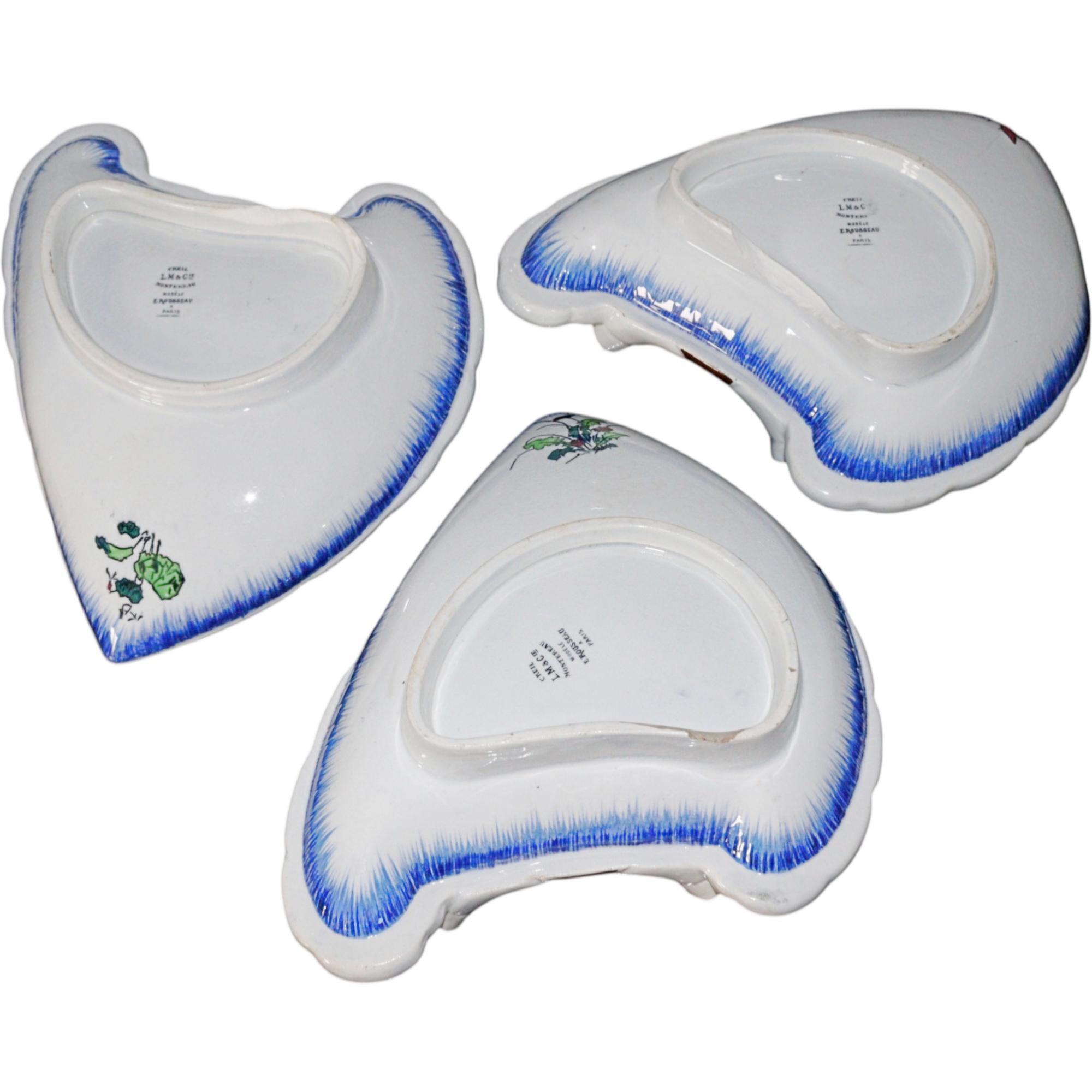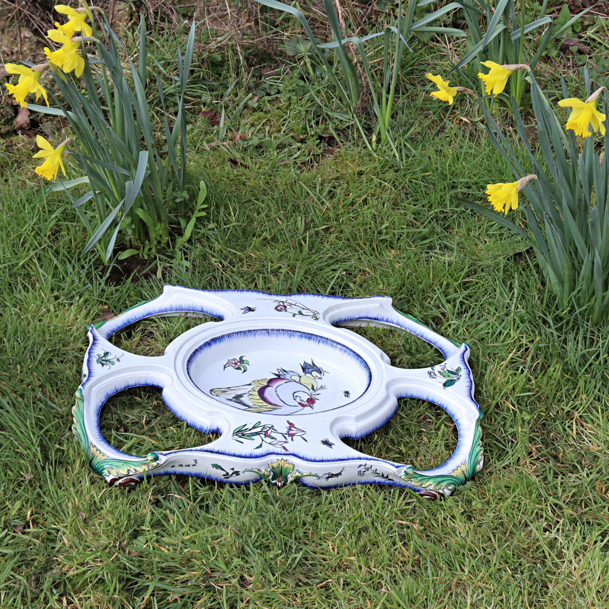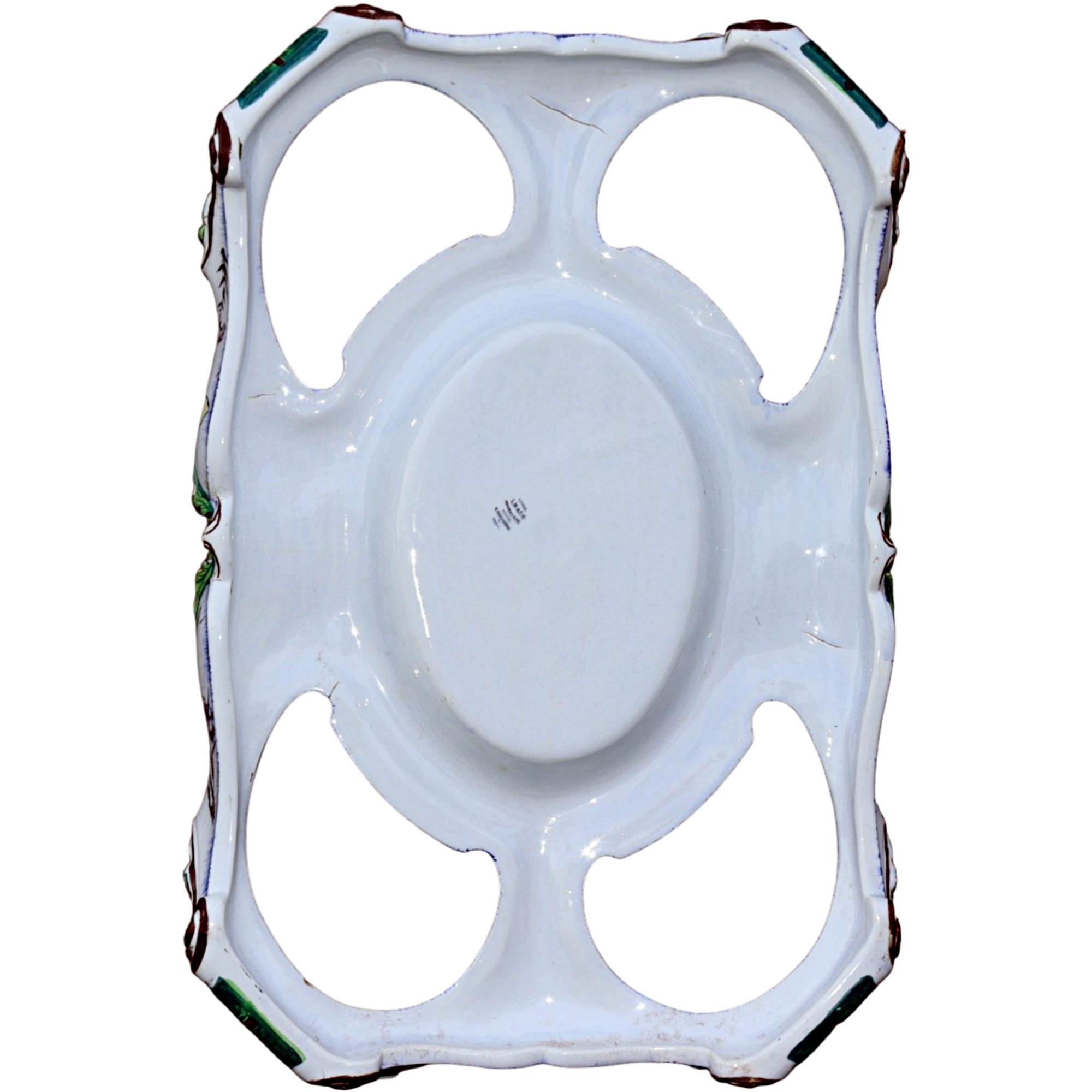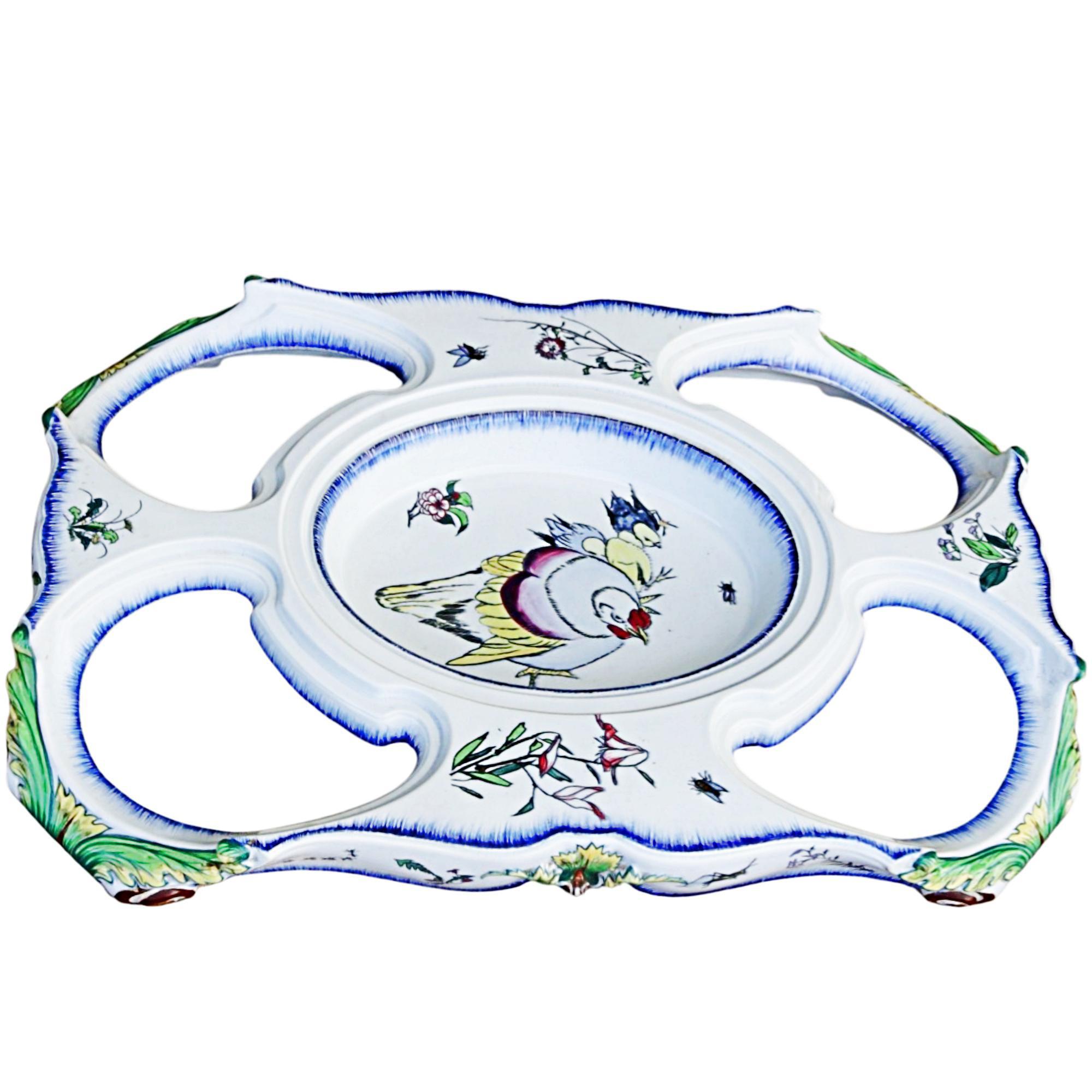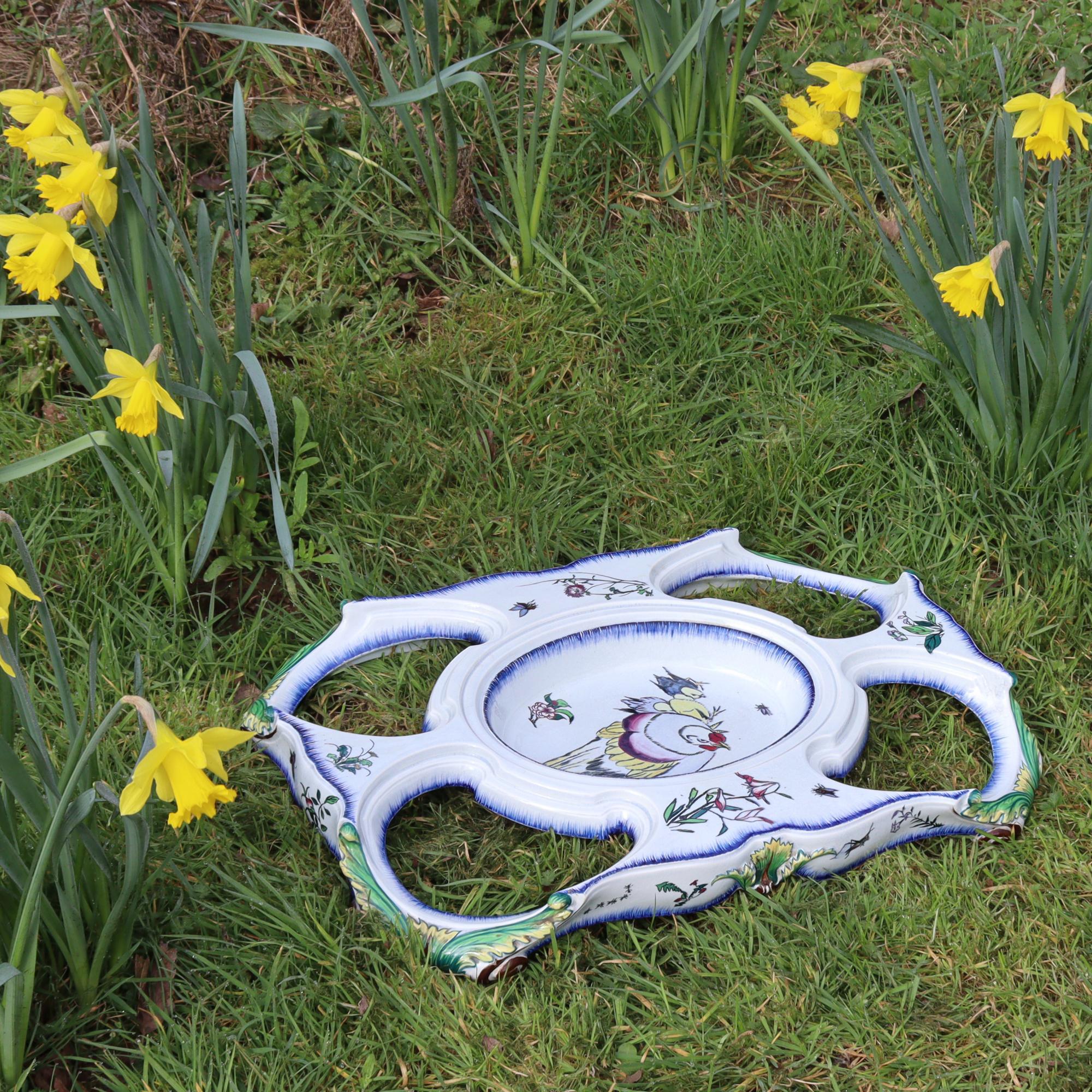 Large pedestal for a centerpiece, Faïencerie creil et montereau, 1840 - 1884, France, faience, black printing stamp underglaze 'Creil B&Cie Montereau Modele E. Rousseau Paris'; pierced, polychrome painted with scenes insects, birds, flowers, heavily damaged and repaired, 9 x 62 x 42 cm