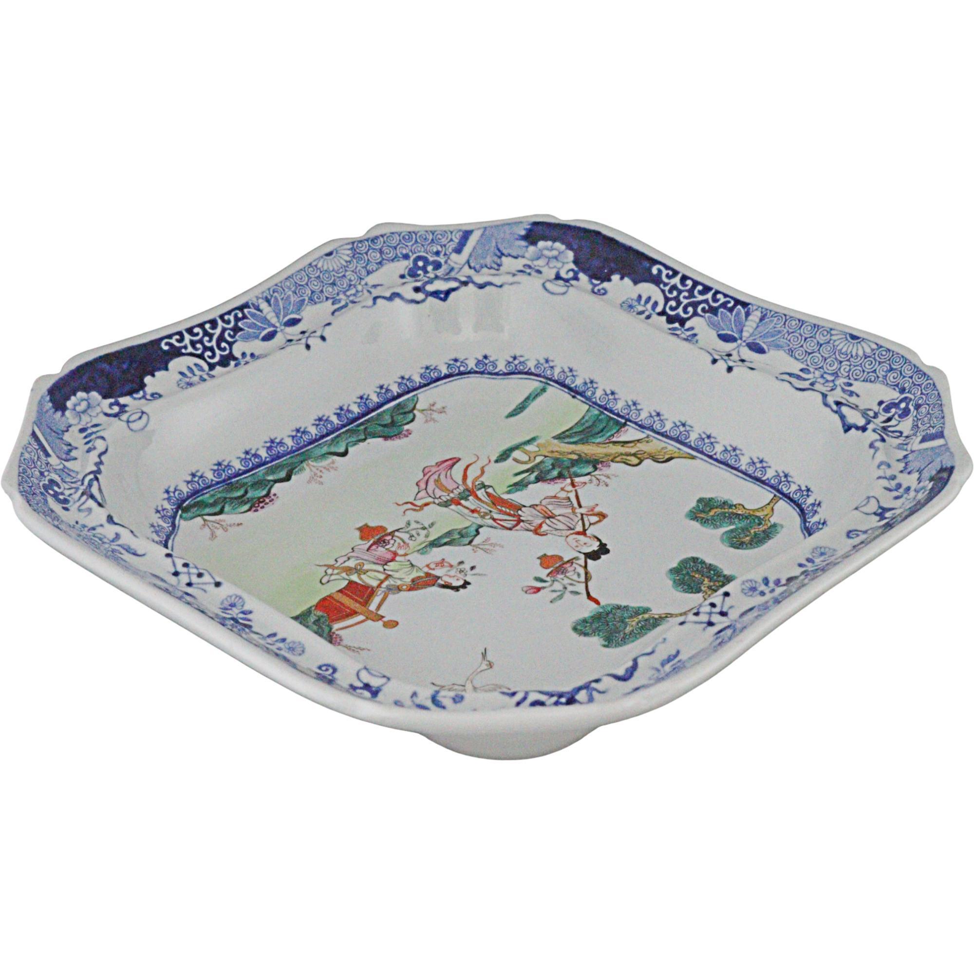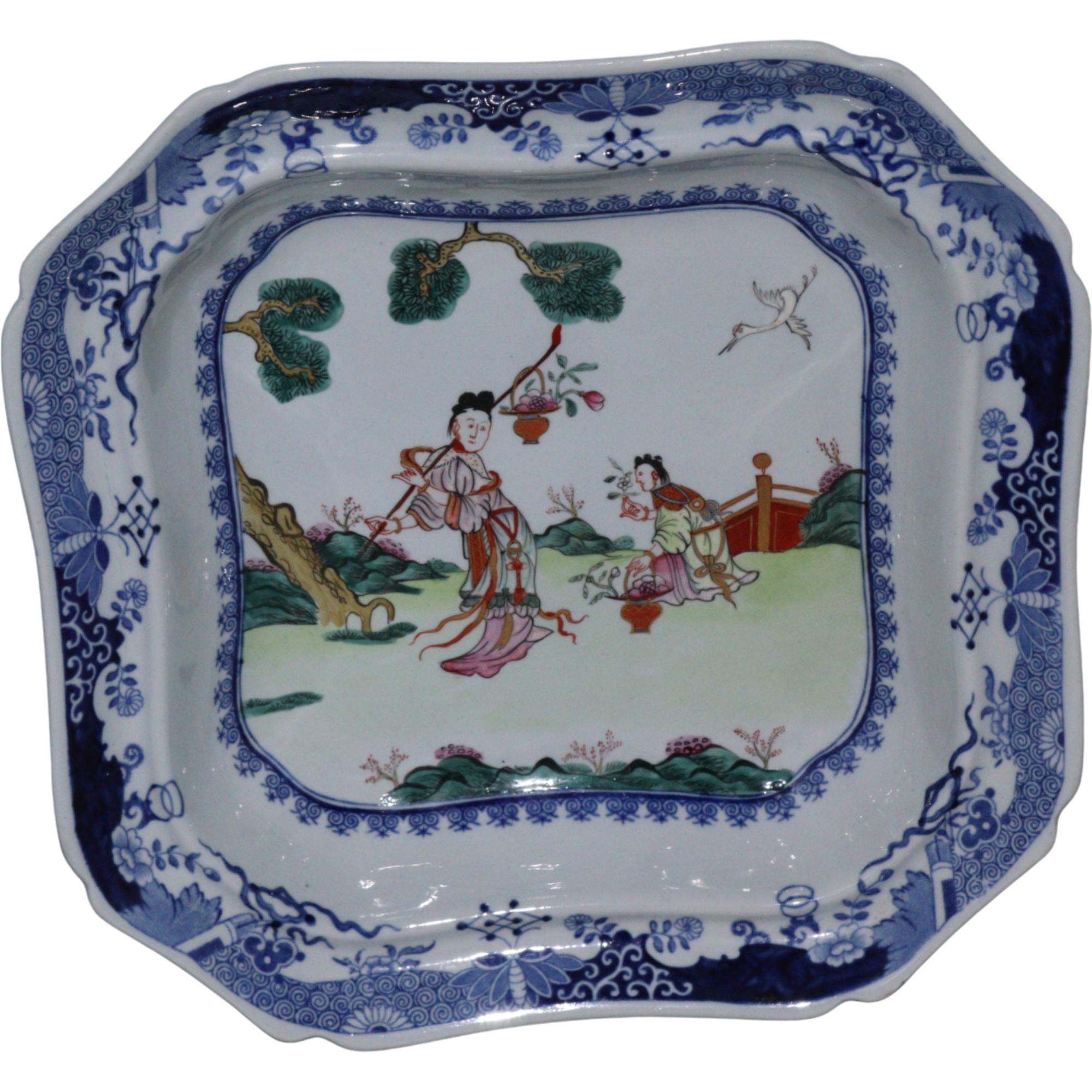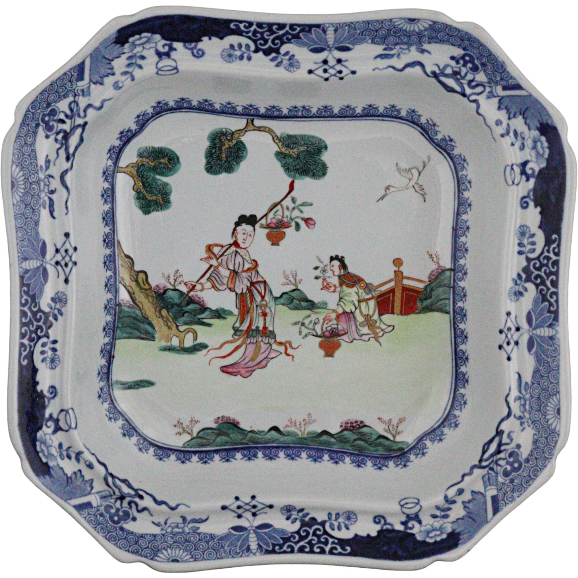Rare Spode new stone dish, canted square form, with hand painted blue and white border the central panel finely painted in enamels depicting Chinese figures in a garden, blue square seal mark to base, circa 1820