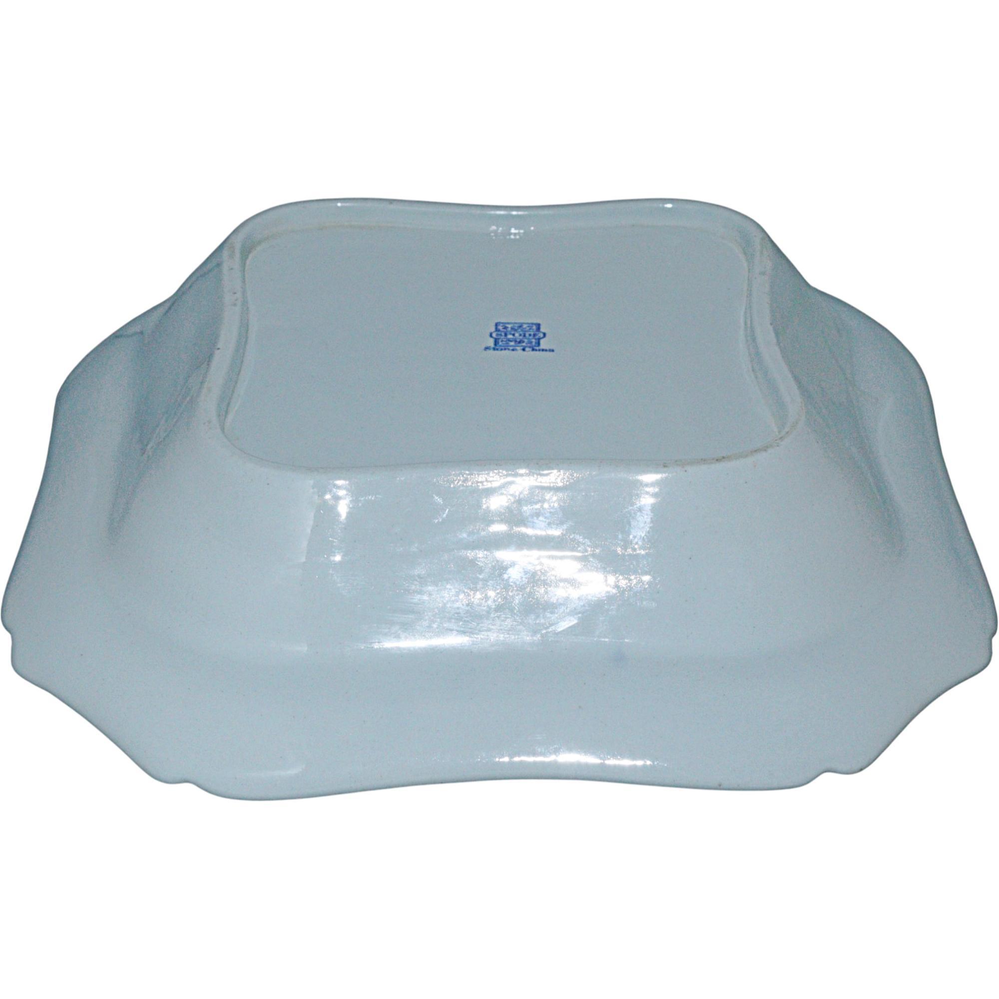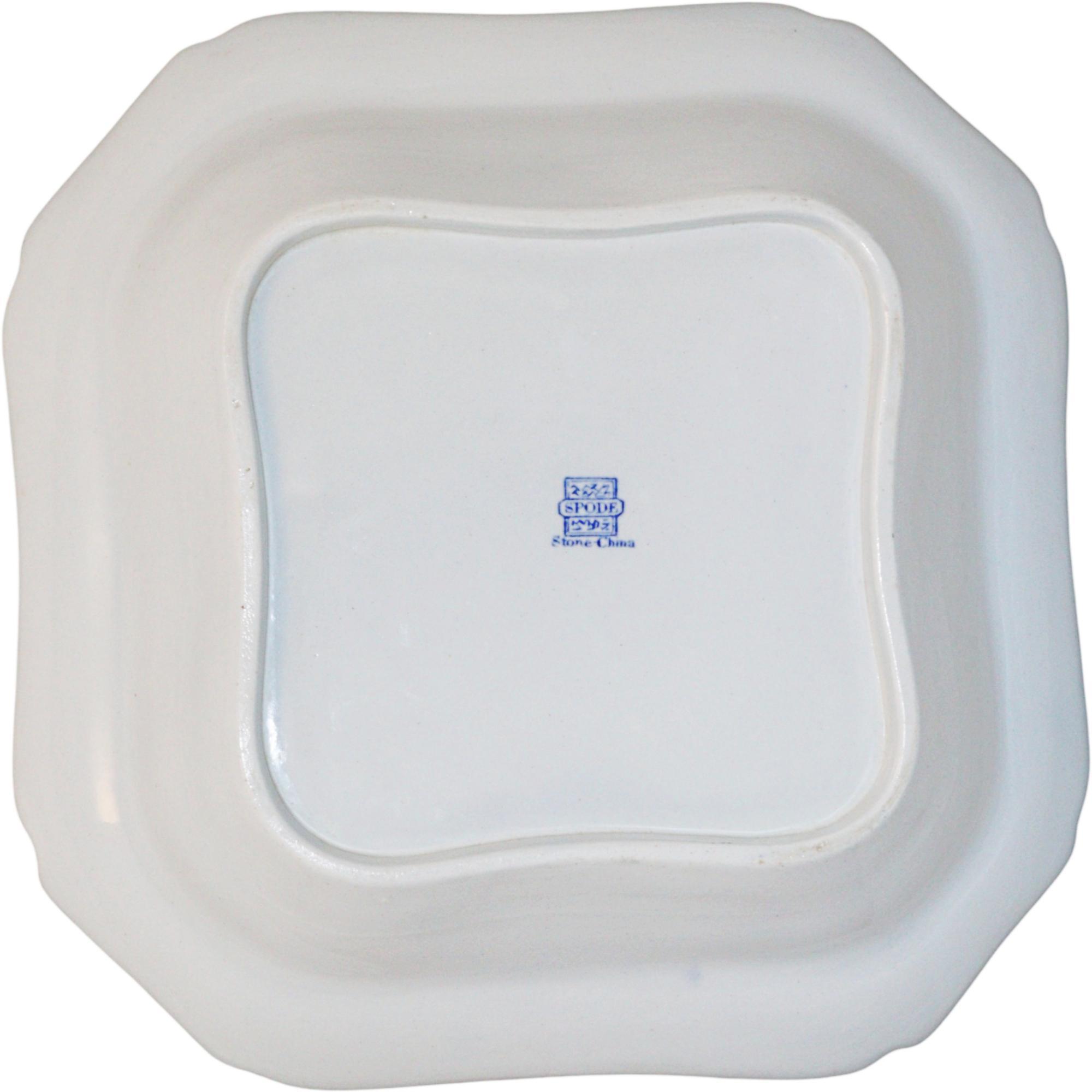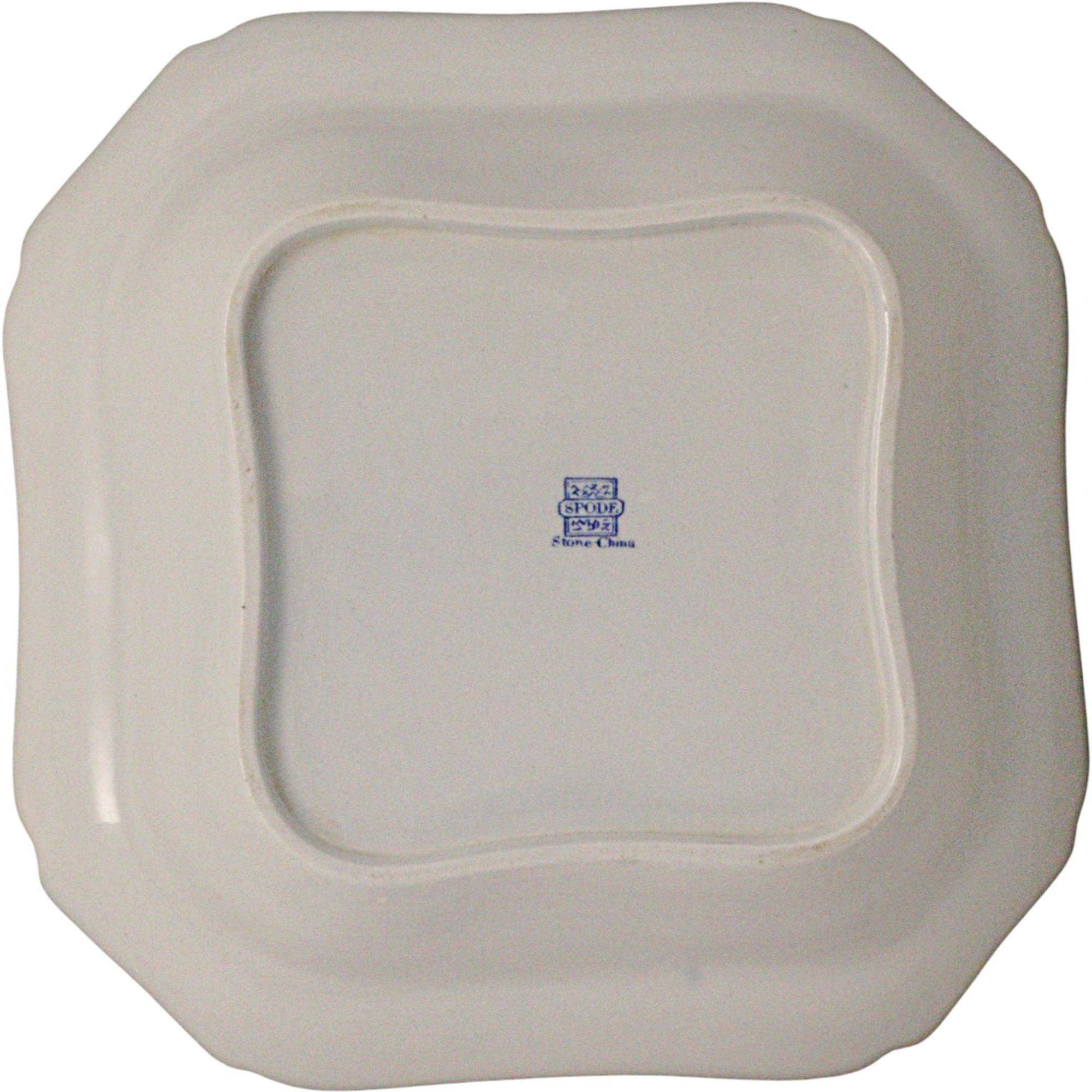 Rare Spode new stone dish, canted square form, with hand painted blue and white border the central panel finely painted in enamels depicting Chinese figures in a garden, blue square seal mark to base, circa 1820