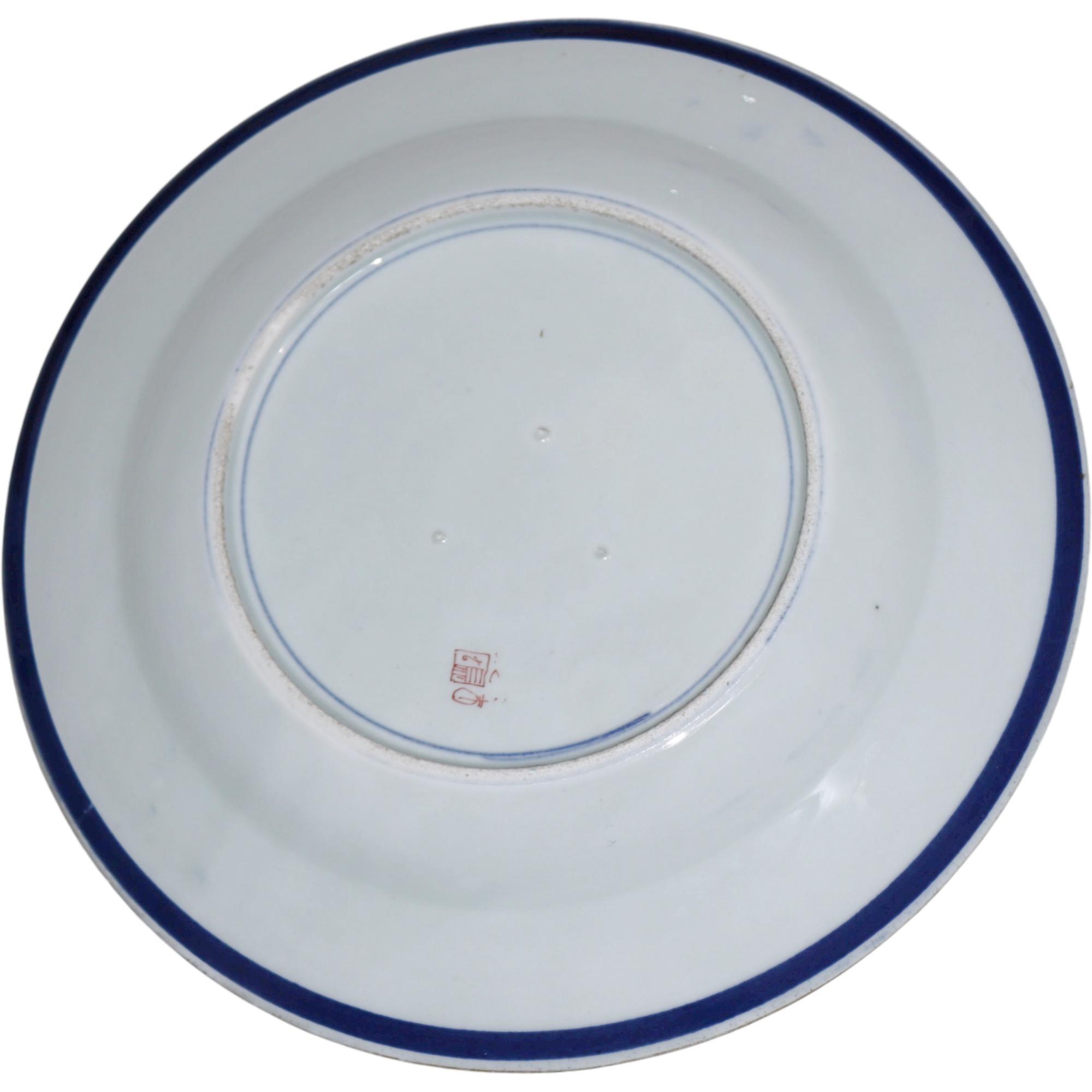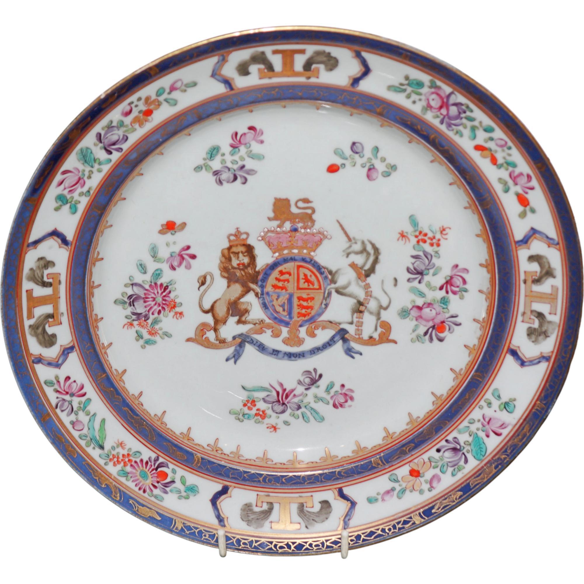 French Samson late 19th century porcelain Armorial cabinet plate, in 18th century Chinese export style, with decorative border and central lion and crown topped crest, flanked by Lion and Unicorn rampant and swaged motto, floral sprays, "DIEN ET MON DROIT", , faux Chinese marks to reverse,