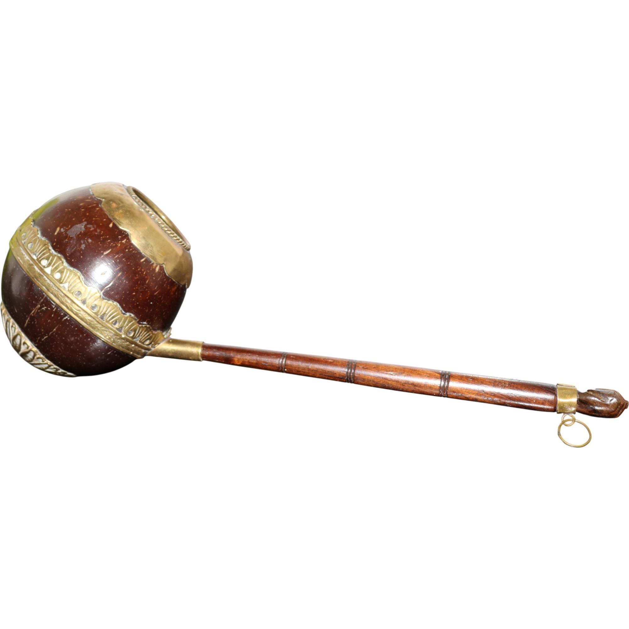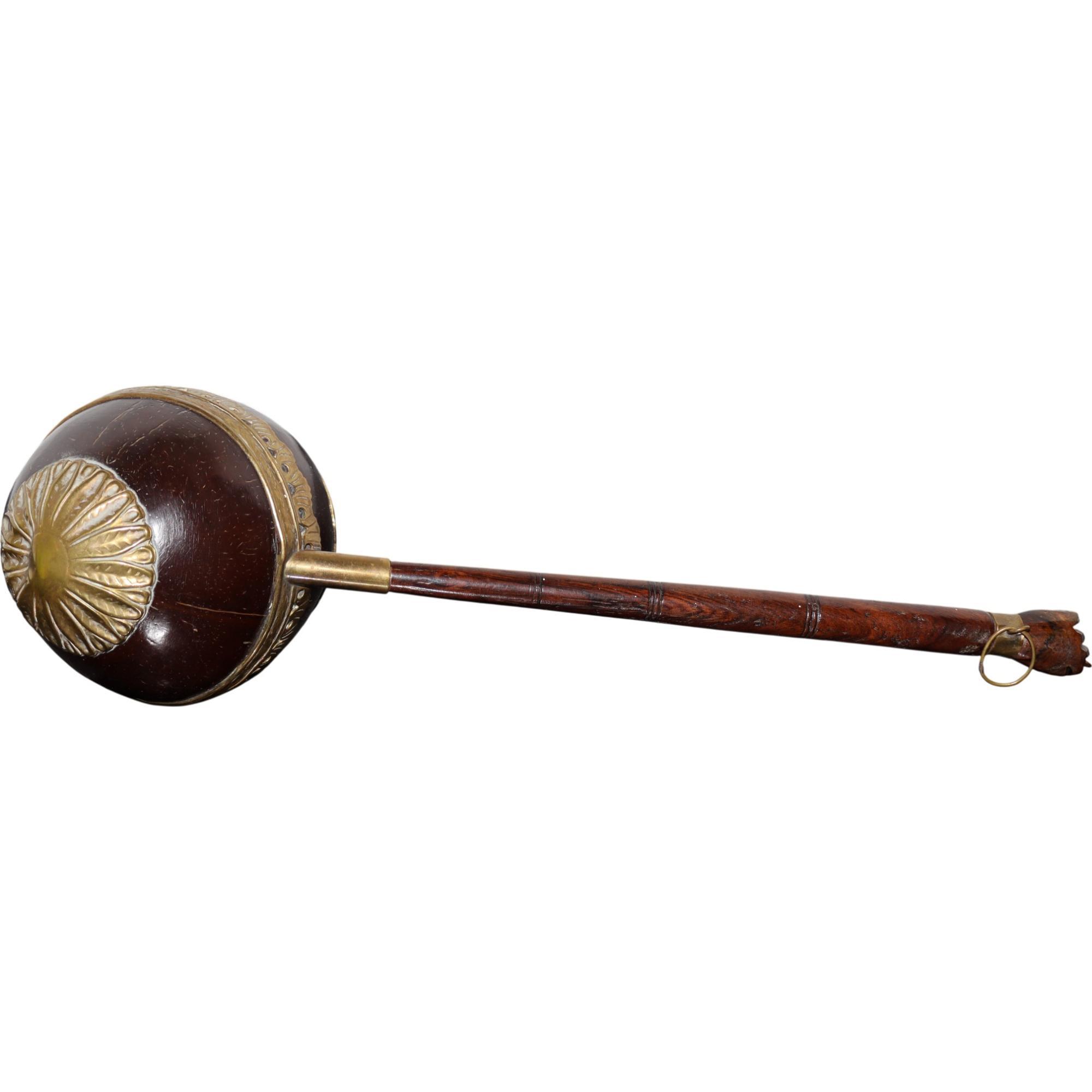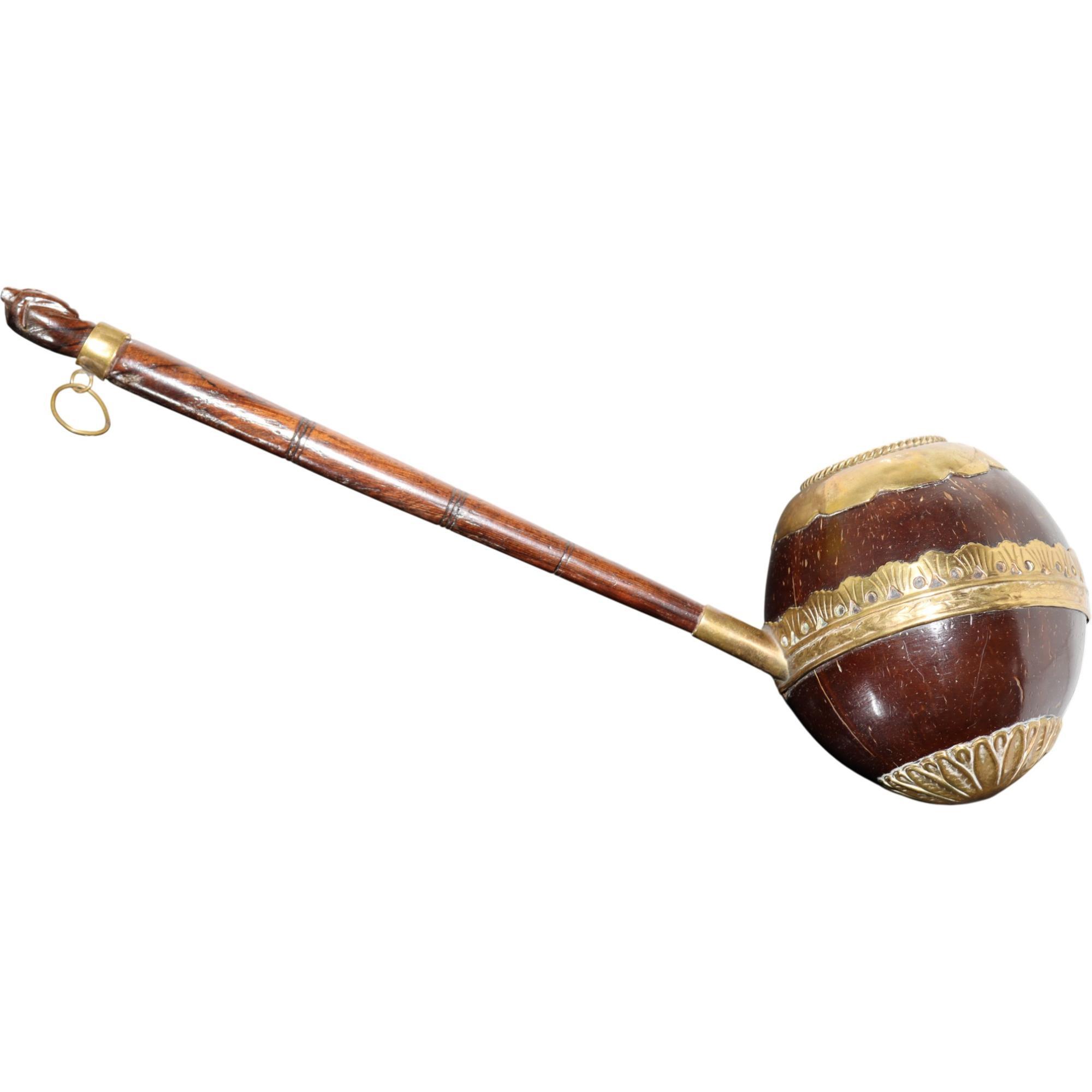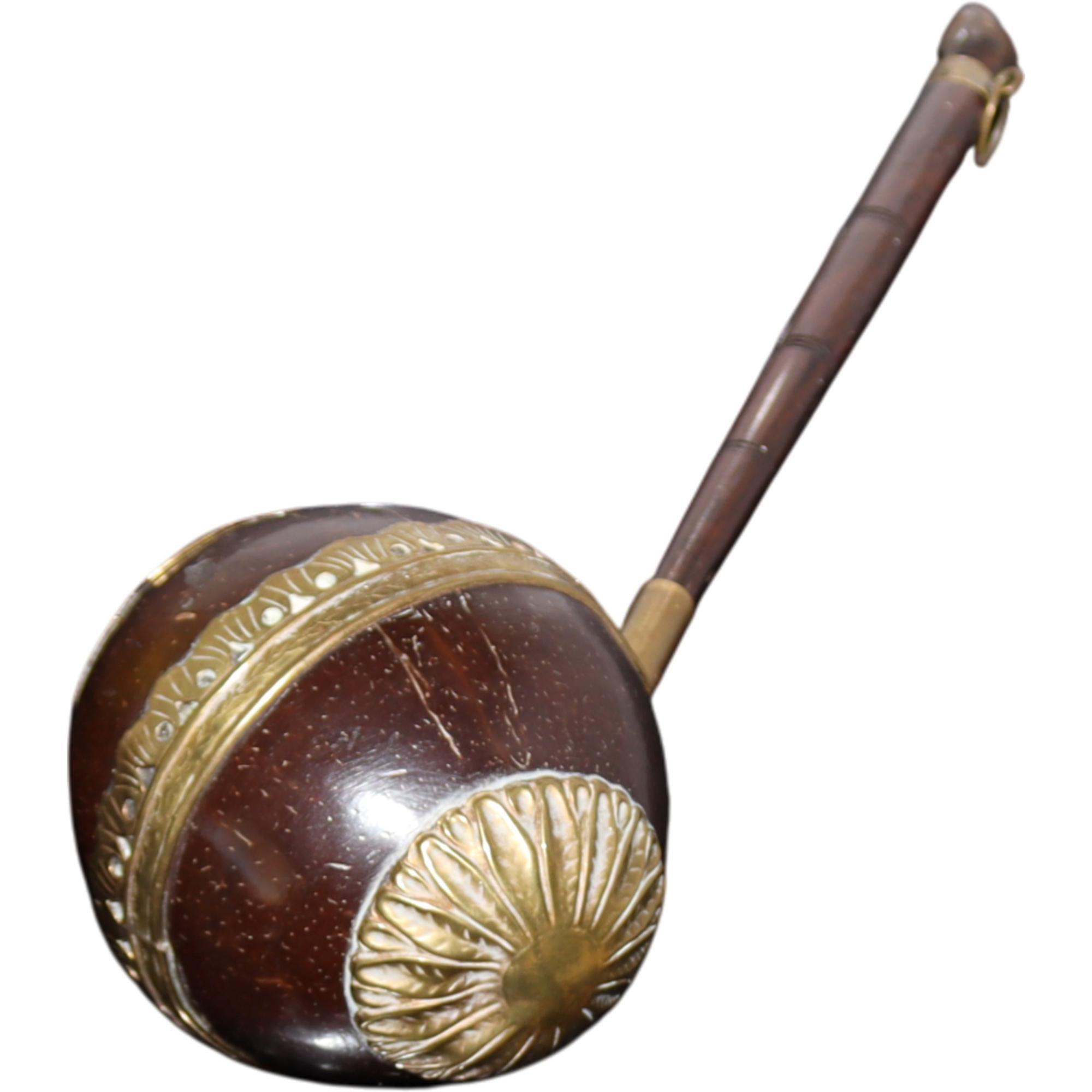 Unusual antique eastern ladle or mate pipe, the with tapered turned wood handle with sectional reeded handle, brass ring collar and ring, ending in carved fist terminal, the polished coconut bowl applied with brass decorative banding, and leaf rosette to base,warm patina, late 19th or early 20th century