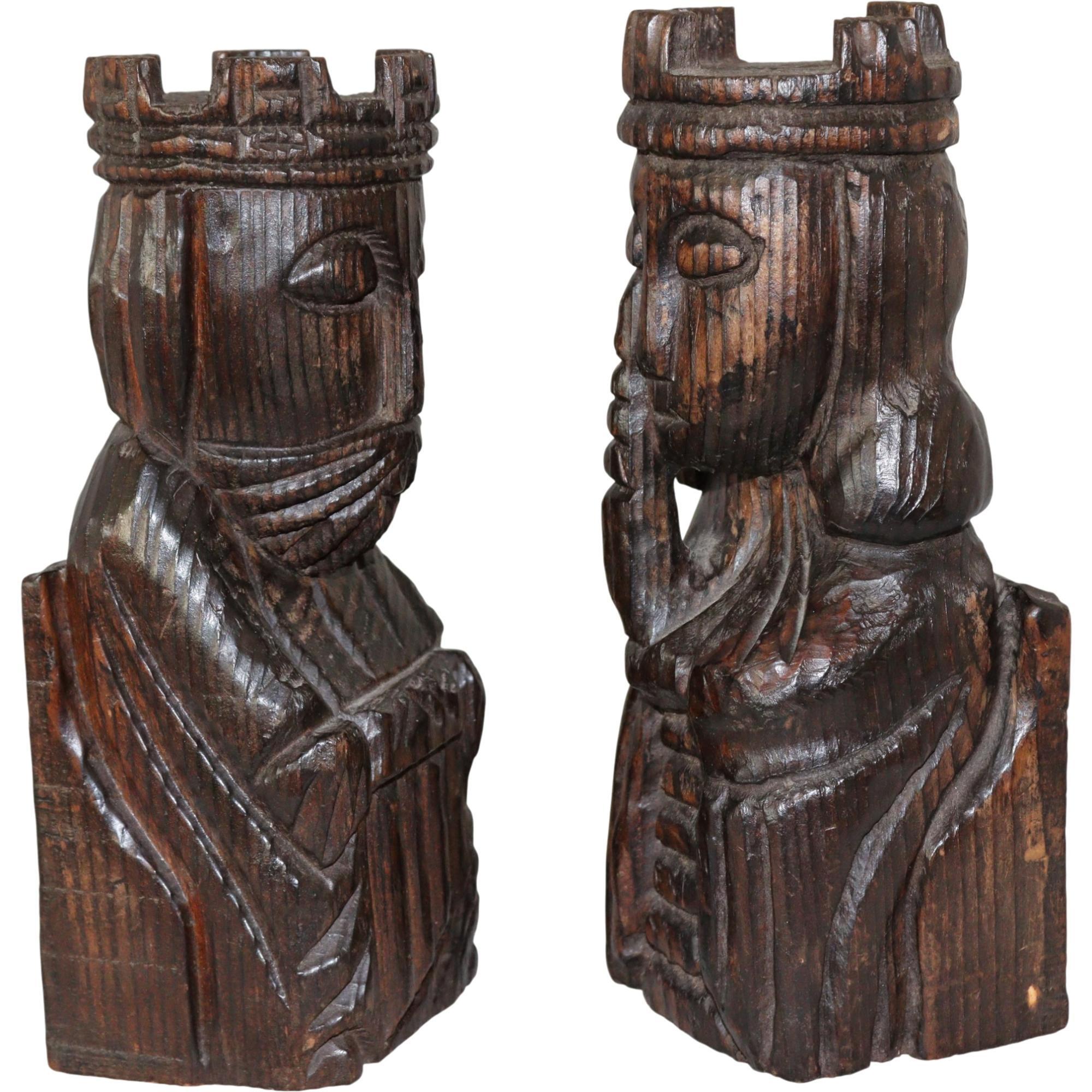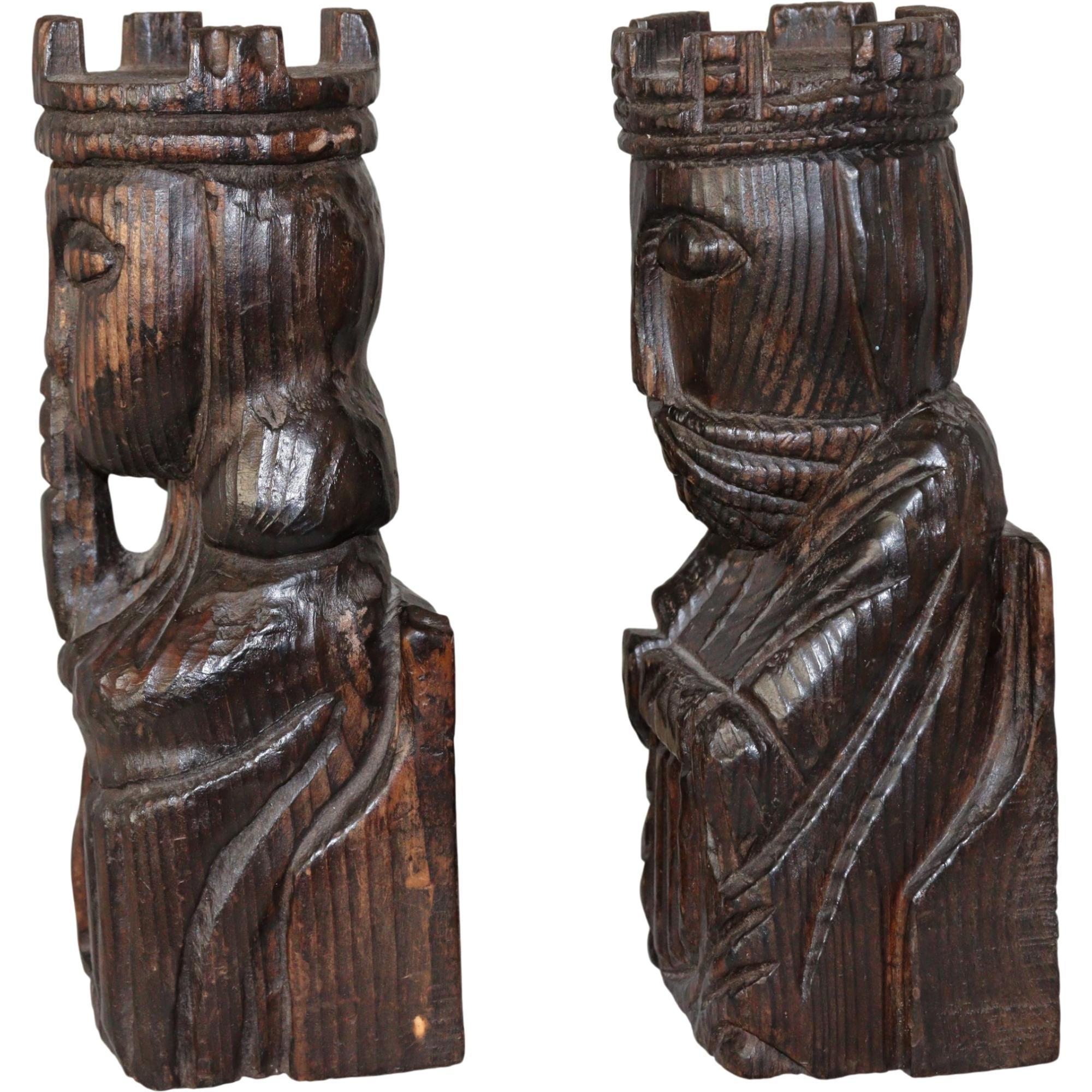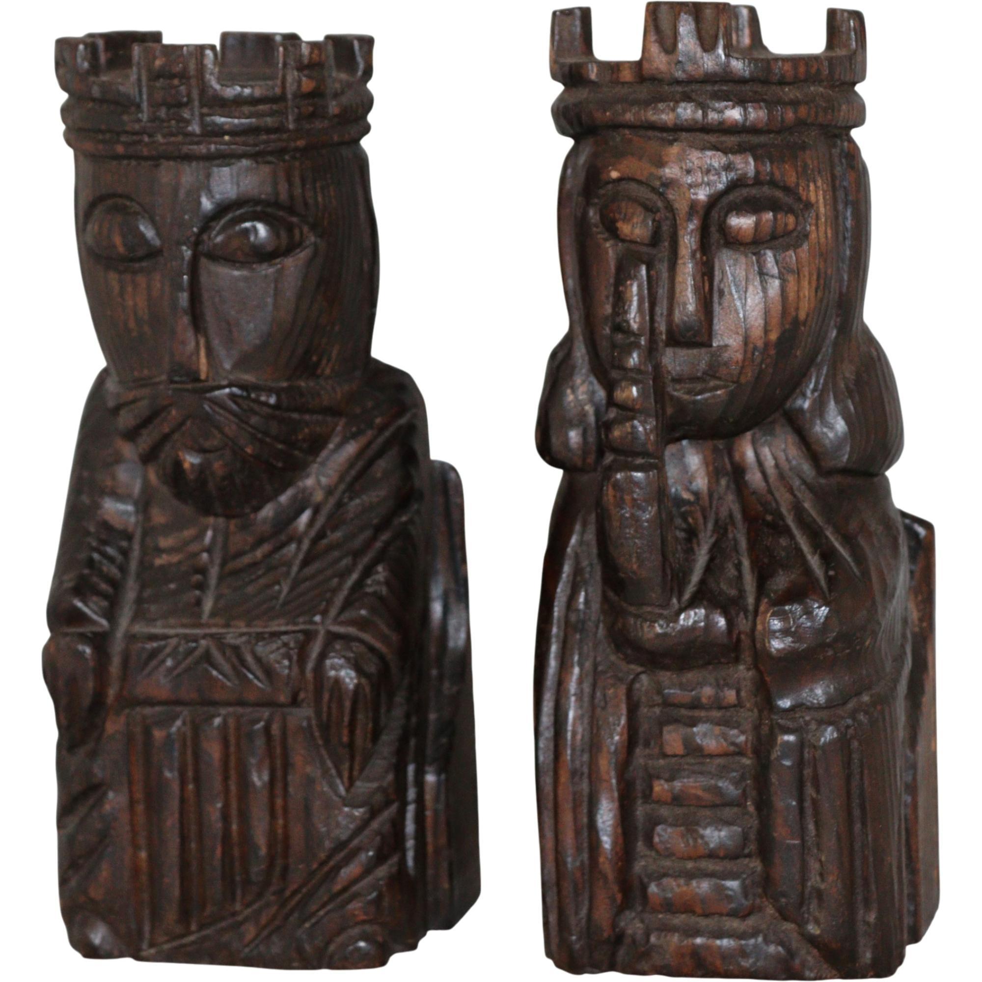 Decorative pair of carved wood figures, depicting a medieval King and tearful Queen, possible bookends,