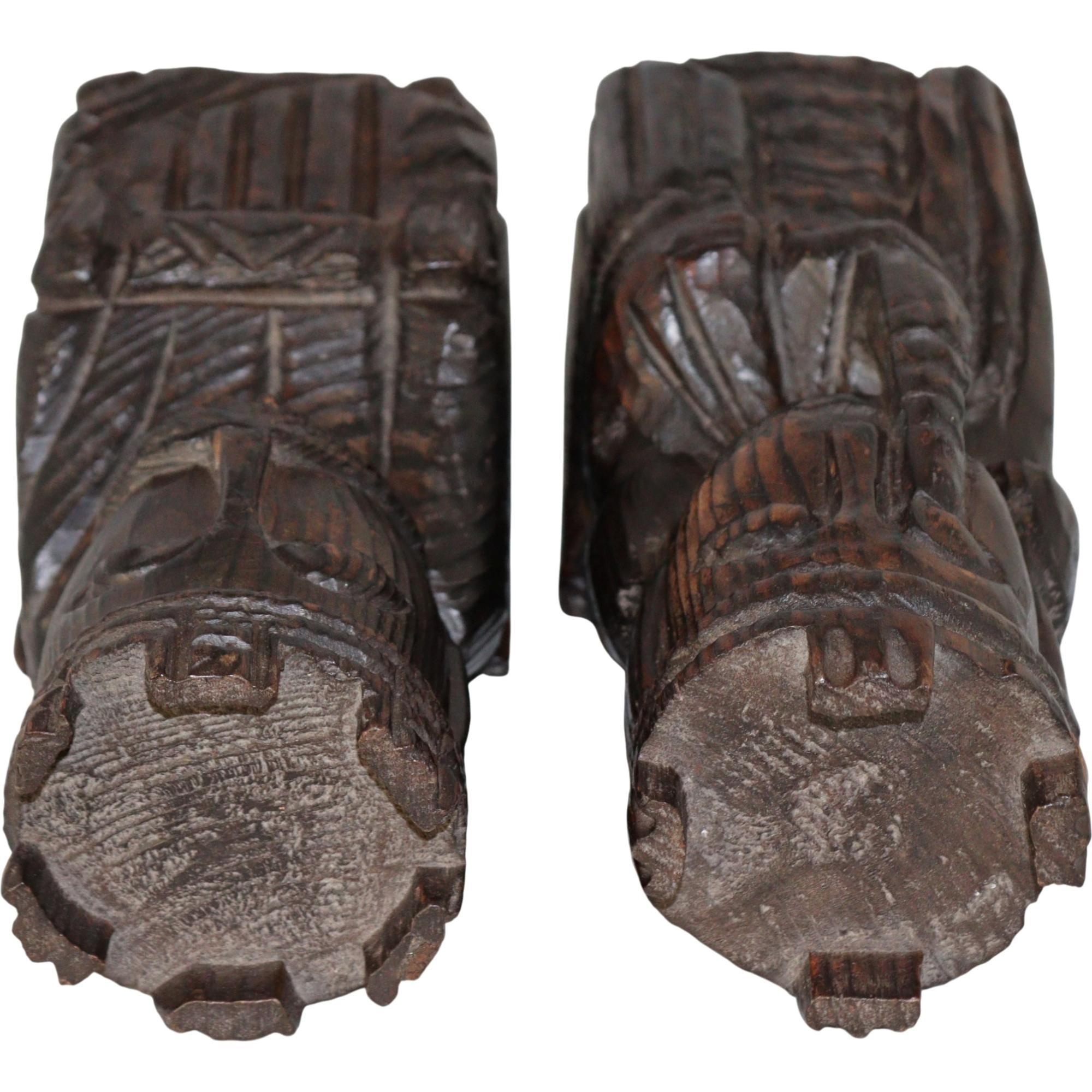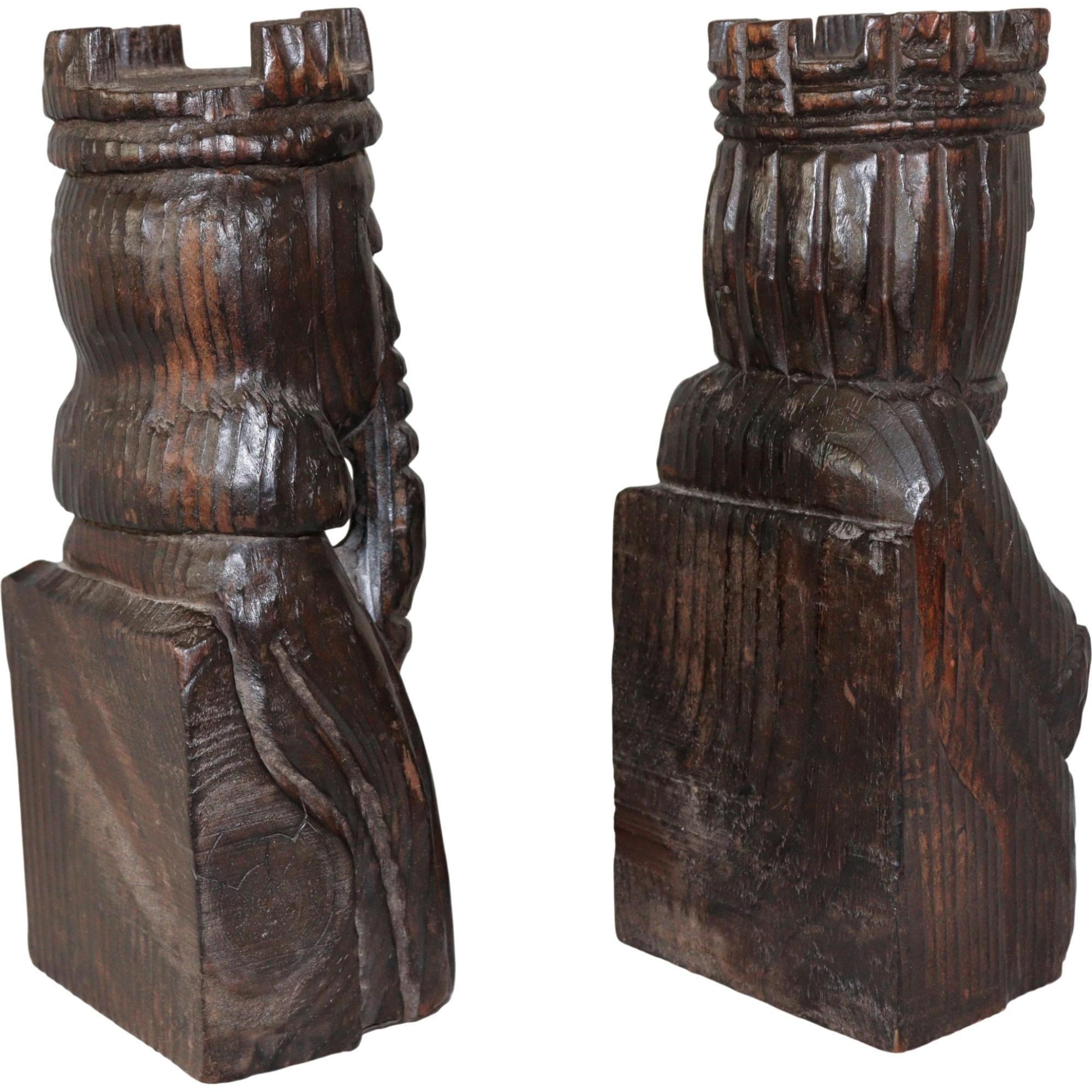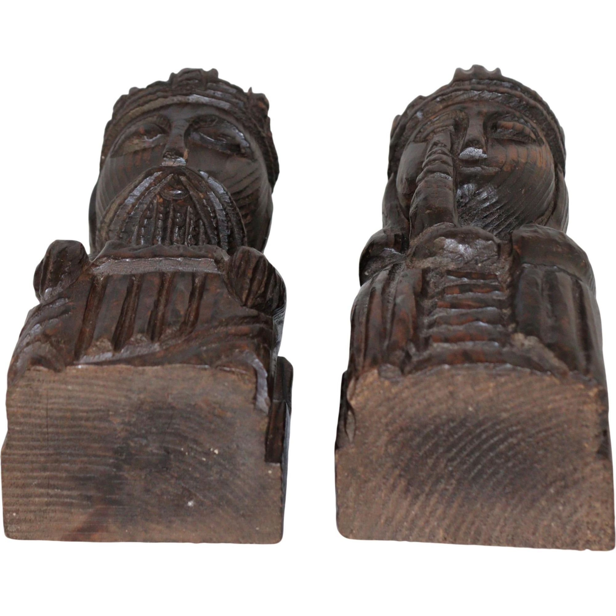 Decorative pair of carved wood figures, depicting a medieval King and tearful Queen, possible bookends,