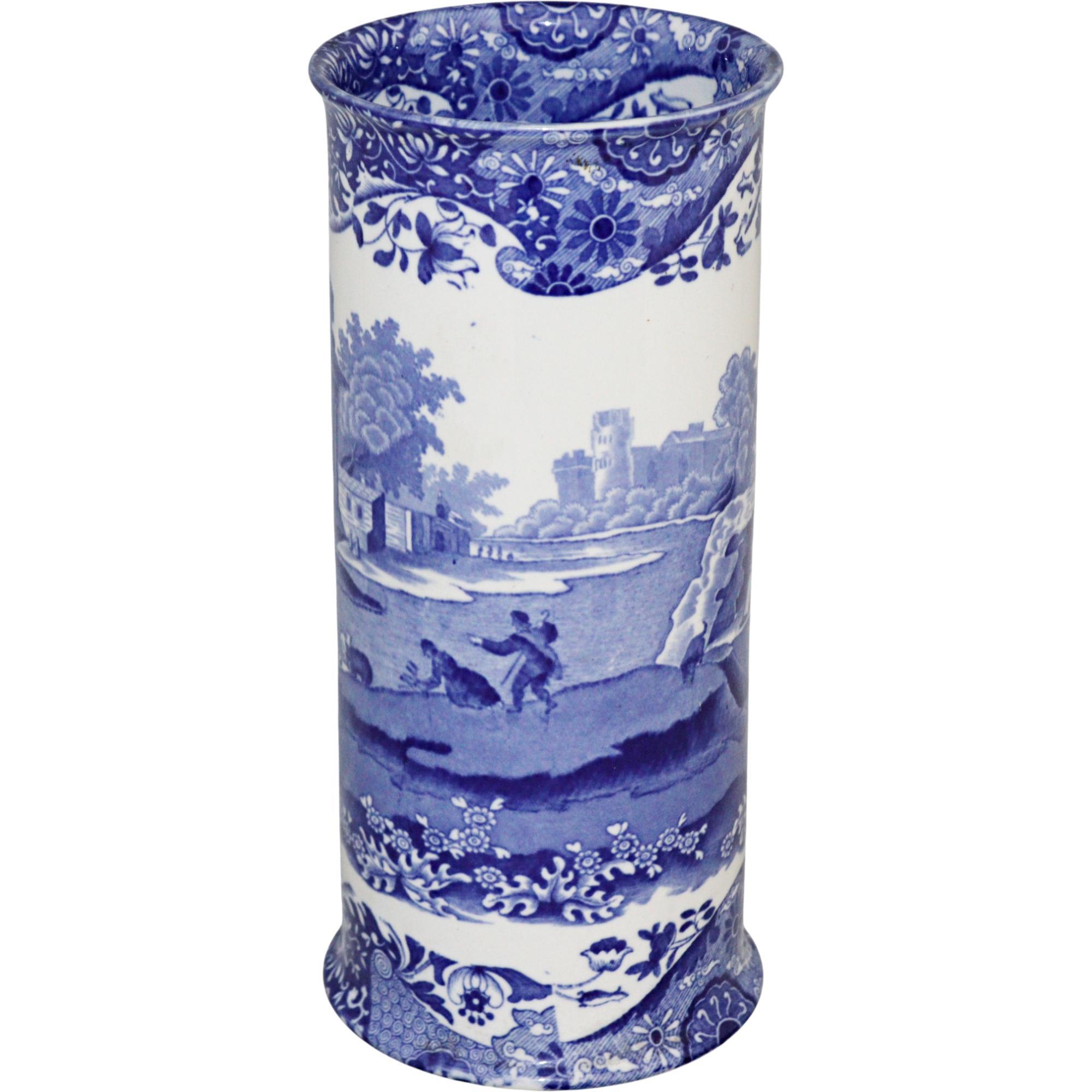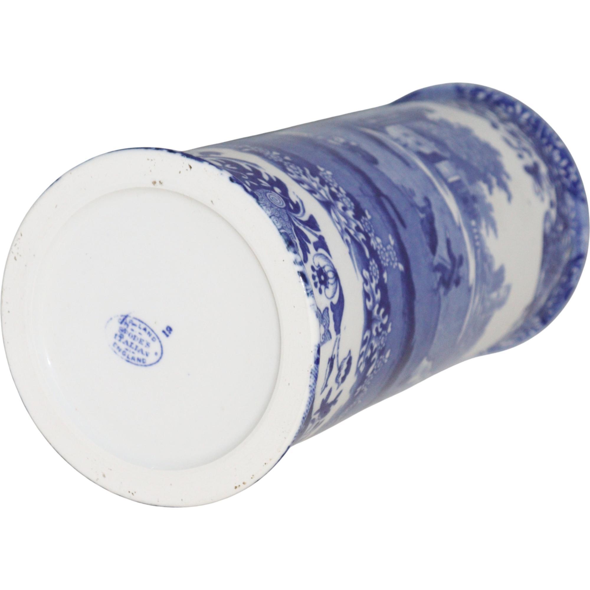 Large Copeland Spode vase, of cylindrical form with slightly flared rim and spreading foot, transfer printed in blue and white with the iconic Italian Pattern also known as Blue Italian, first produced in 1816 and still manufactured today, printed oval blue marks, early 20th century