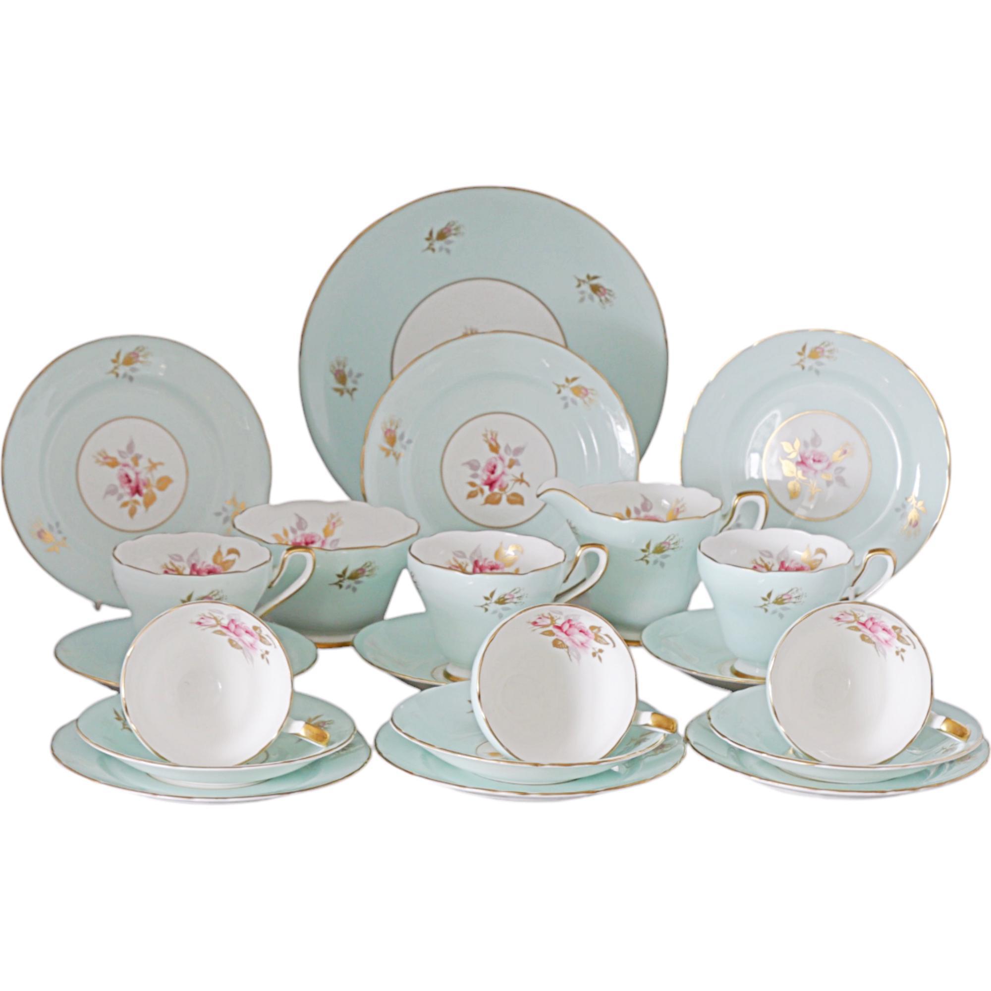 Hudson and Middleton pottery, Sutherland China, 21 piece tea service, duck egg blue with delicate roses and rose buds, printed marks, mid century, circa 1950
