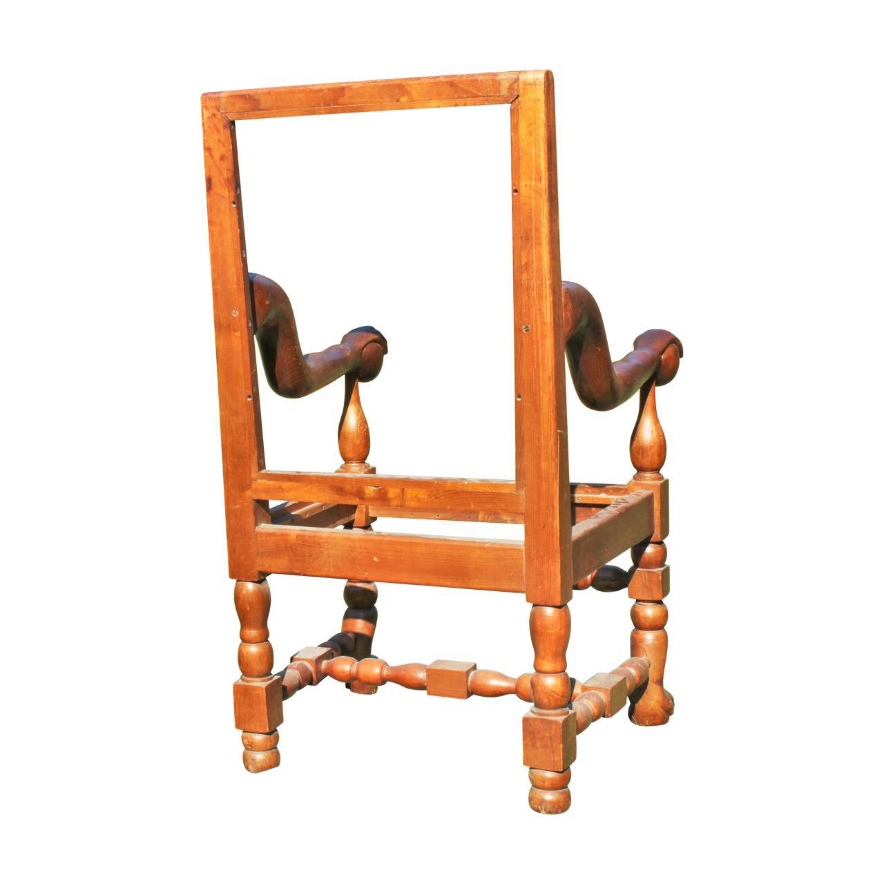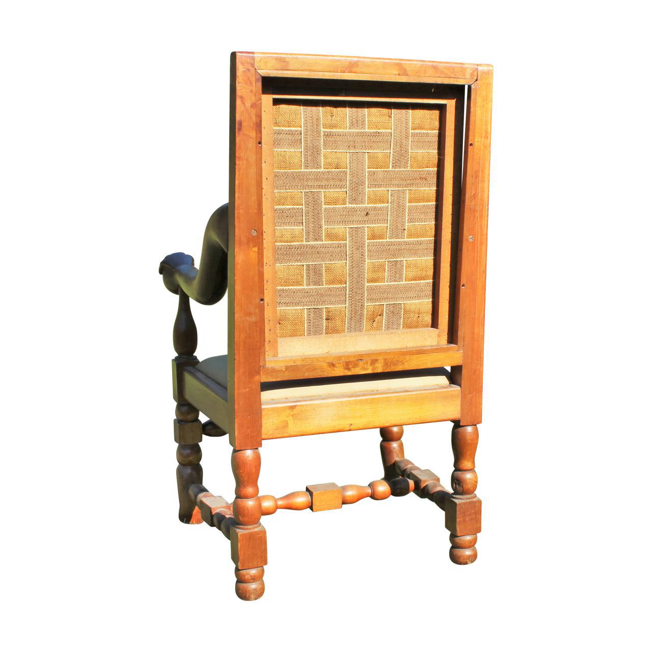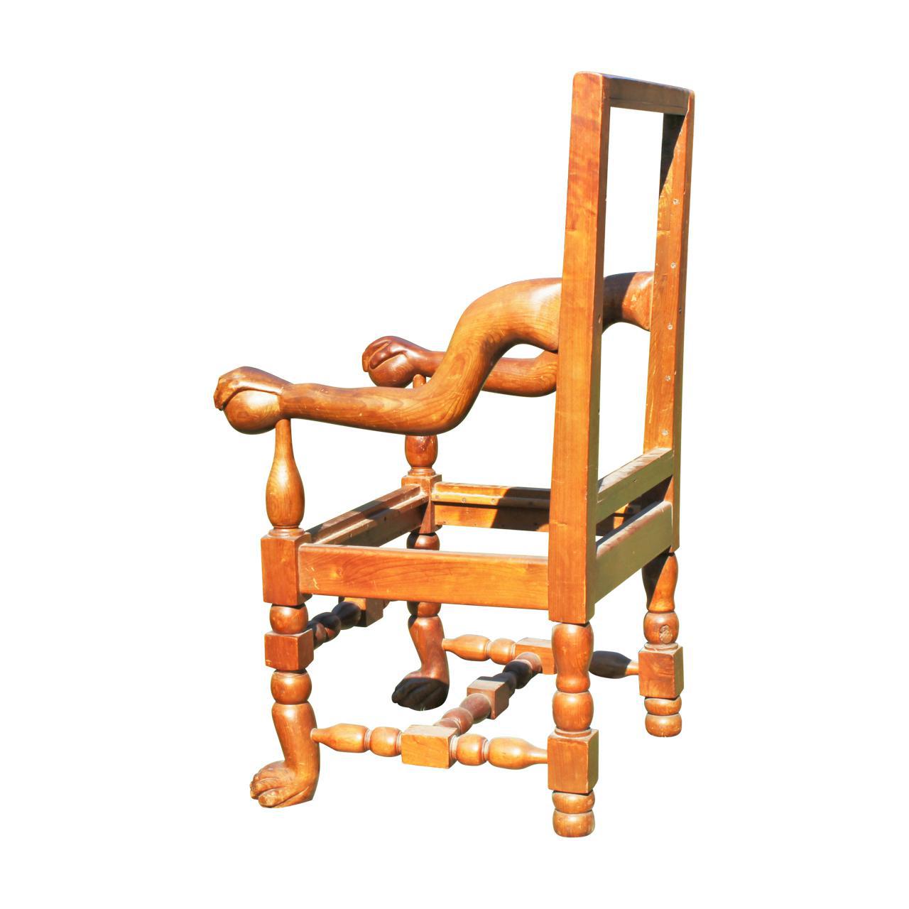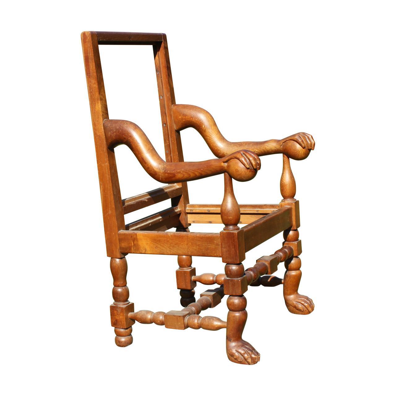 Quite extraordinary open armchair, pine, with hand and ball terminals, the t turned supports ending in chimpanzee like feet, very difficult piece to date, probably early 20th c