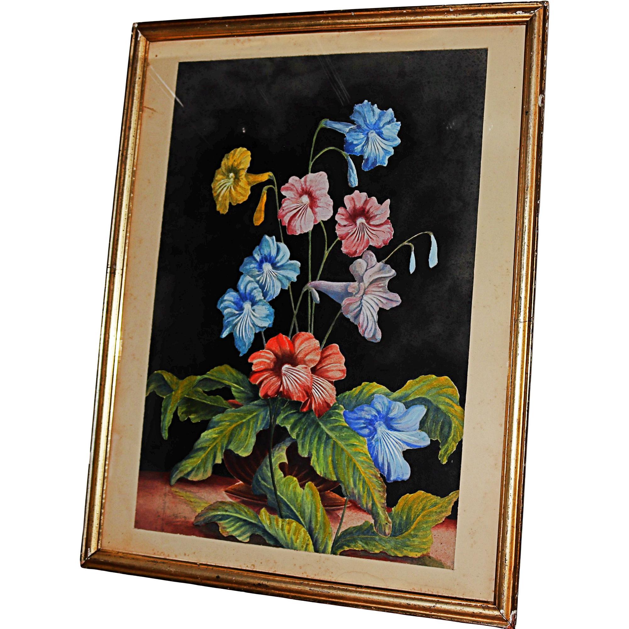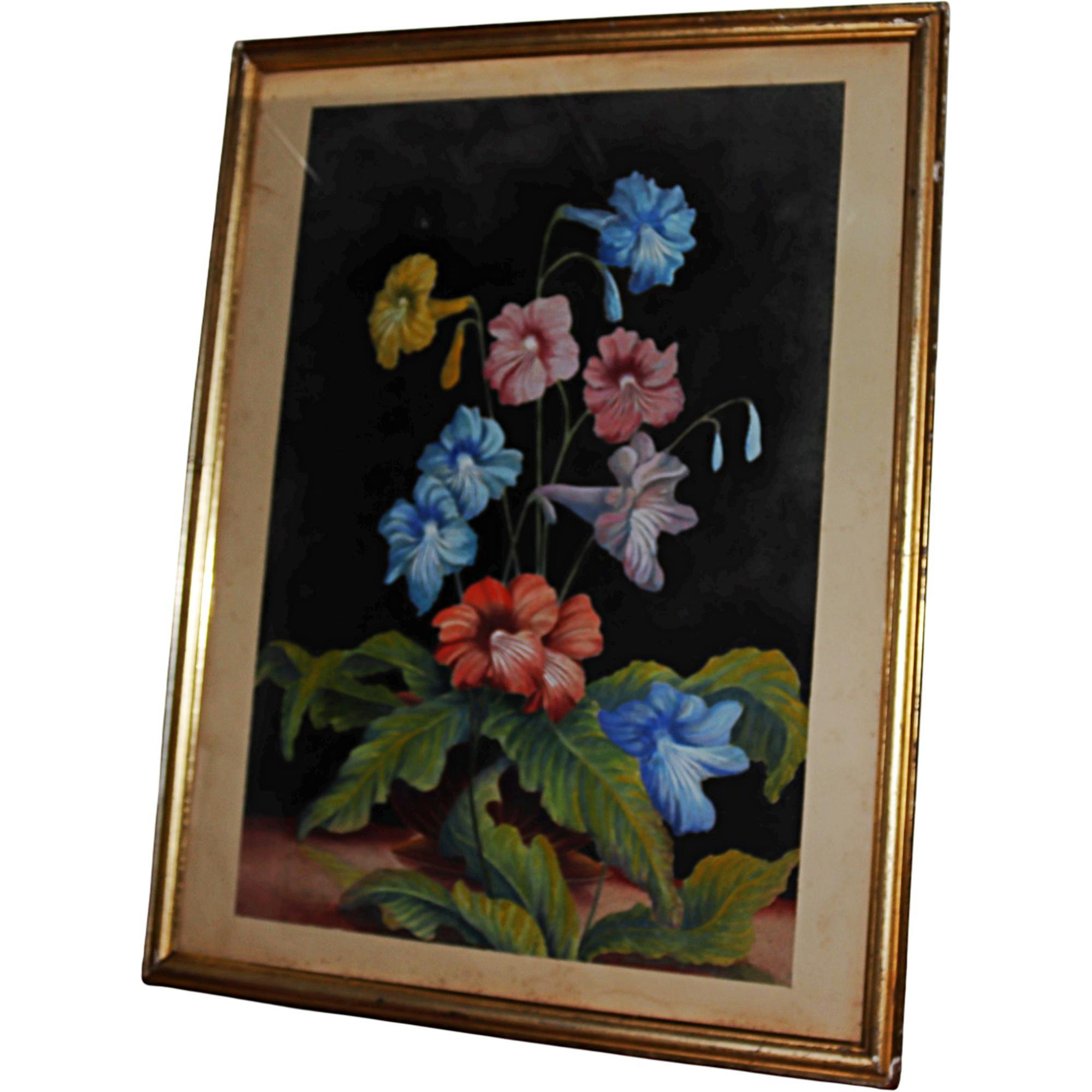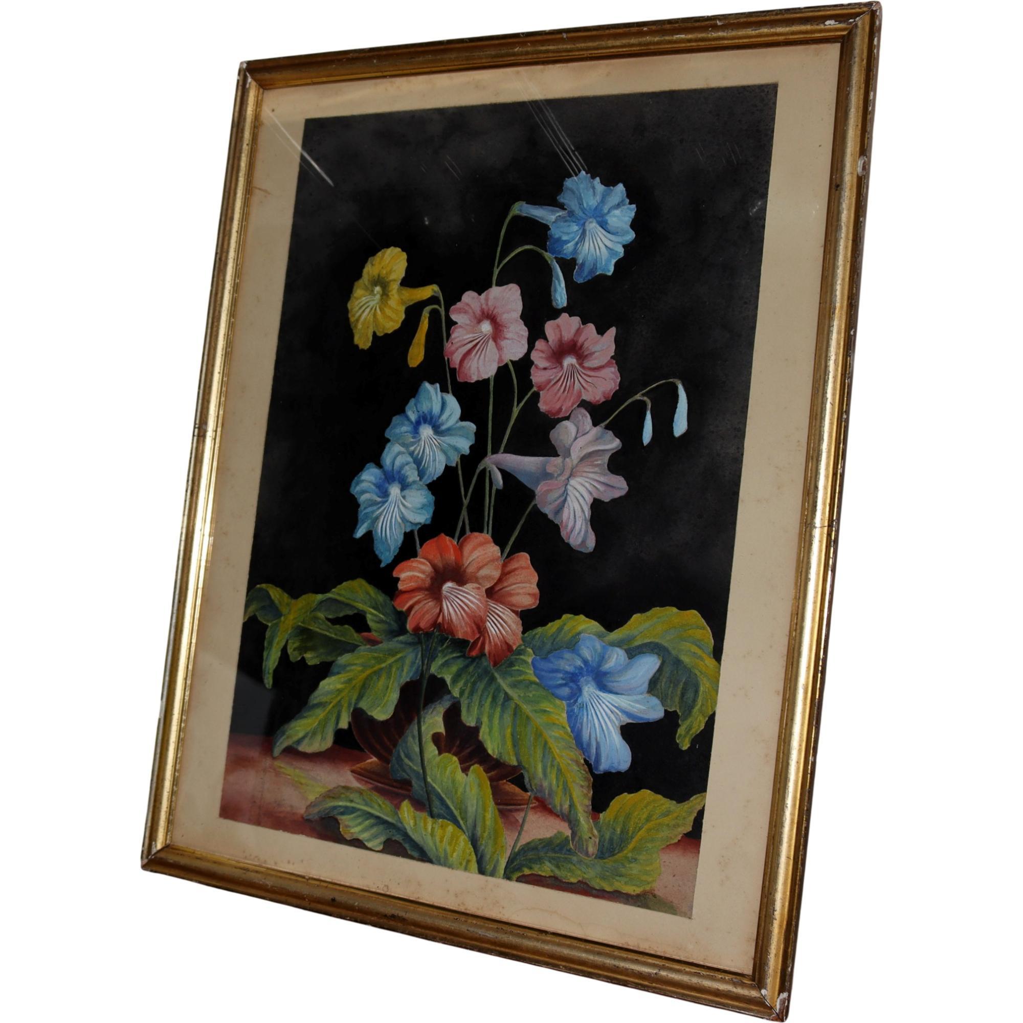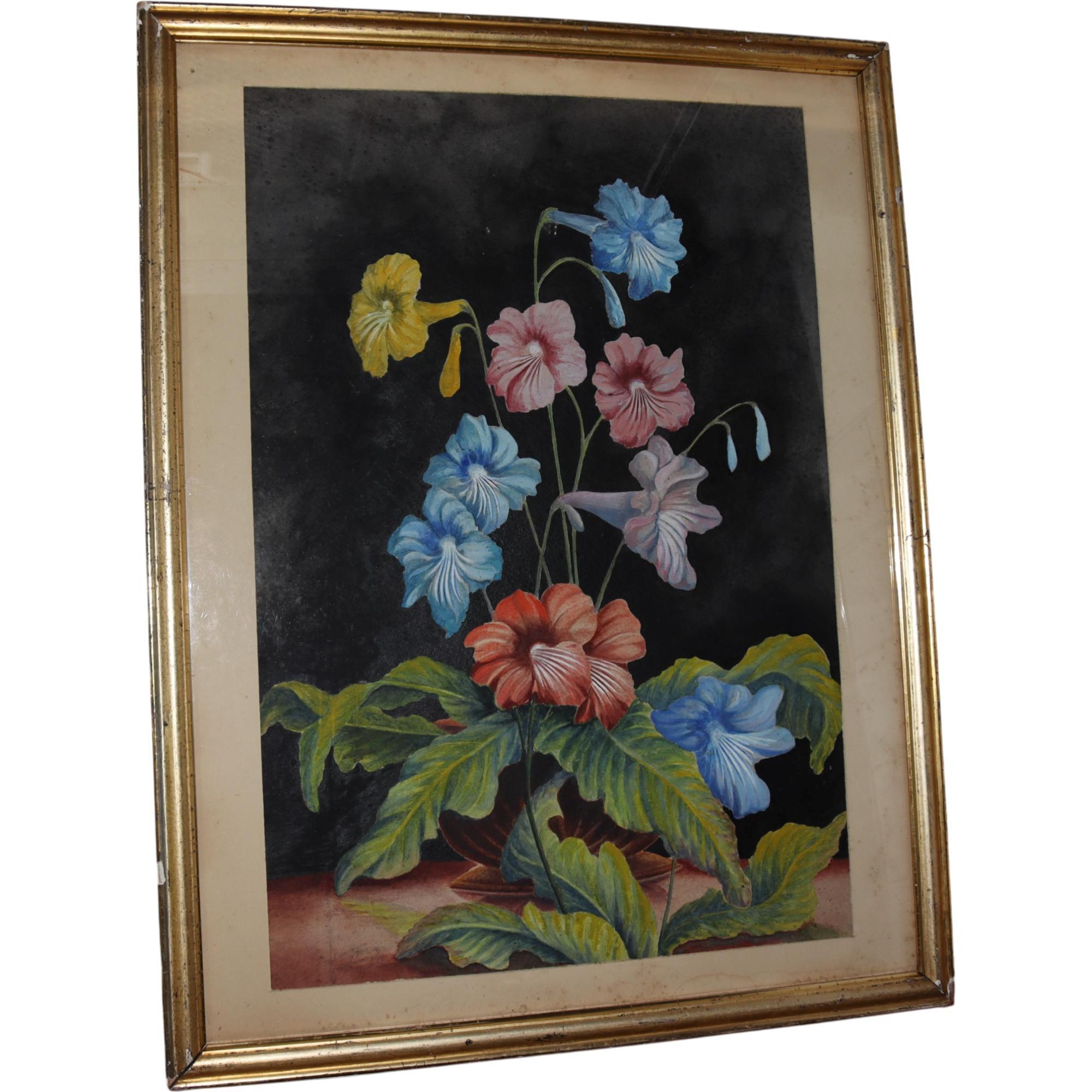 Large decorative watercolour, flowering Streptocarpus, against a black ground, in gilt ands glazed frame, details verso, E Lawrence, 1930