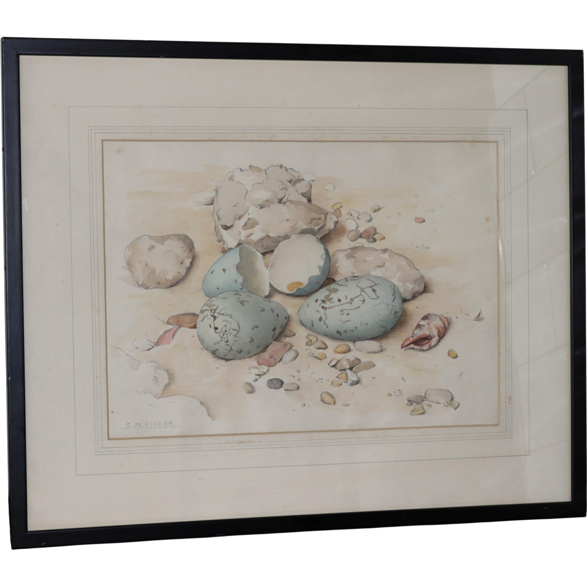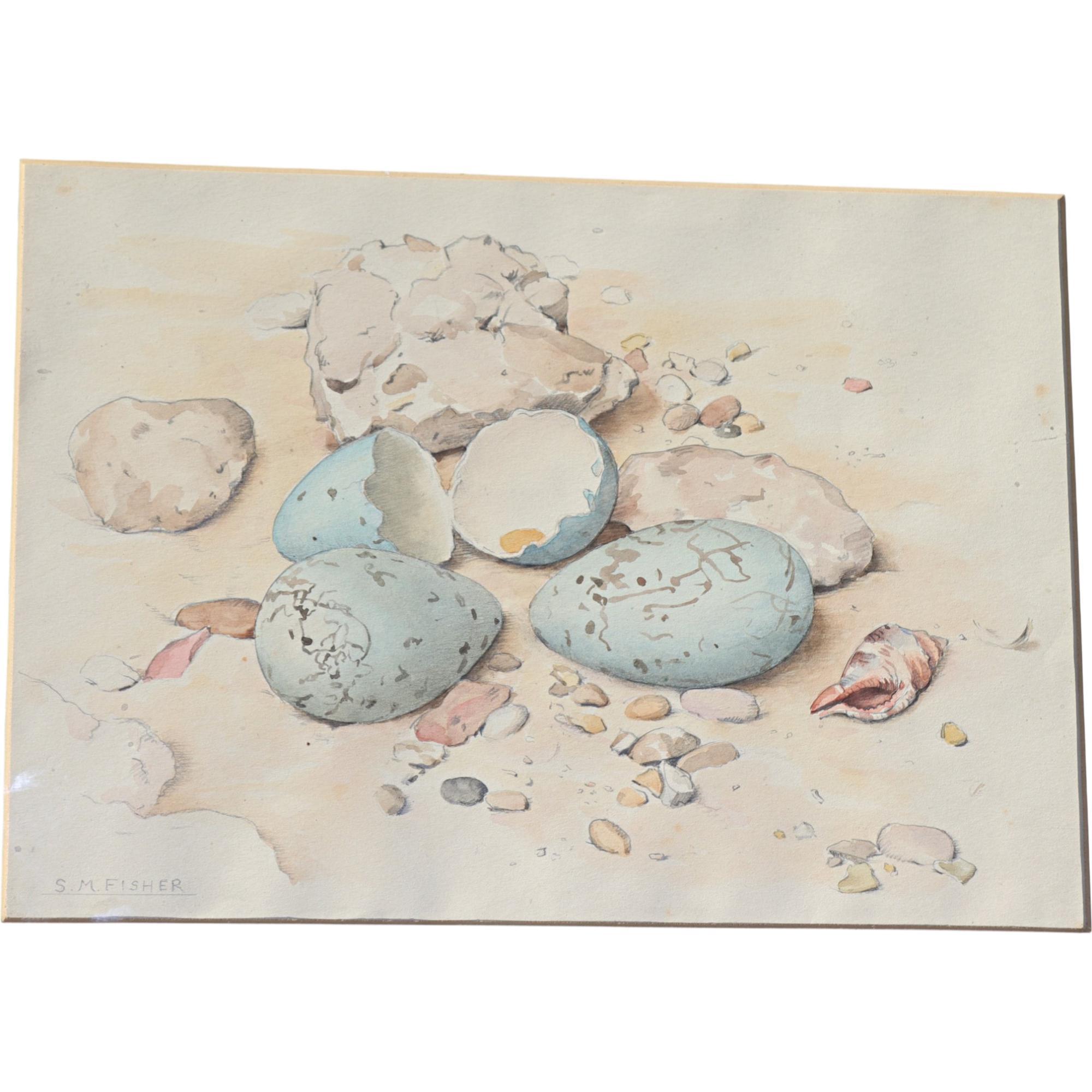 Stefani Melton Fisher, British, 1894-1963, , watercolour, still life, gulls eggs,pebbles and shell on the sea shore, signed lower left, framed and glazed, circa 1930